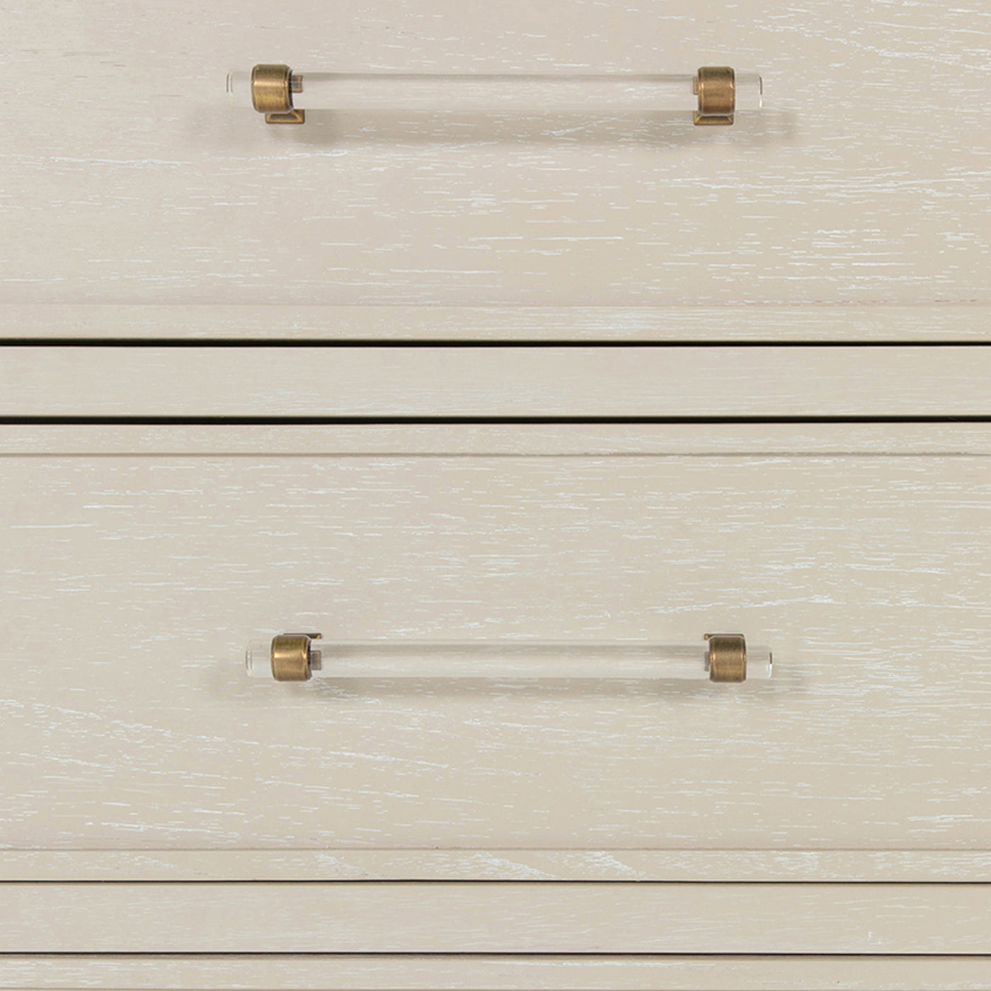 The Alexandra Chest exudes elegance and modern sophistication with its cerused white finish and clear acrylic accents. Crafted from high-quality mindy wood, metal, and acrylic, this chest features three spacious drawers that offer ample storage. The stained gold detailing adds a touch of luxury, while the clear acrylic handles provide a contemporary flair. Perfect for any bedroom or living space, the Alexandra Chest combines functionality with stylish design, making it a standout piece in any decor. This product uses natural or handmade materials, so variations in color and pattern are to be expected and celebrated.