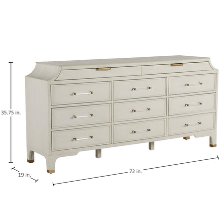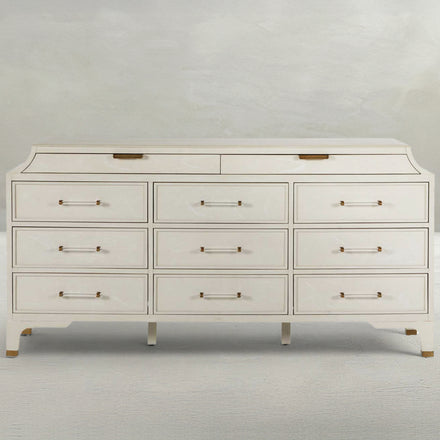 The Alexandra Dresser combines timeless elegance with modern functionality, making it a perfect addition to any sophisticated bedroom. Crafted with meticulous attention to detail, this dresser features a smooth, cerused white finish that highlights the natural beauty of the wood. The dresser is adorned with nine spacious drawers, each with an acrylic handle, offering ample storage for clothing and linens, while the two narrow drawers at the top provide excellent storage for smaller accessories. Each drawer is accented with sleek, brass-finished handles, adding a touch of glamour to the piece. The subtle curves and clean lines of the dresser's design lend it a refined and classic look, while the sturdy mahogany construction ensures durability. Ideal for organizing your wardrobe in style, the Alexandra Dresser effortlessly blends practicality with luxury, elevating the decor of any room.