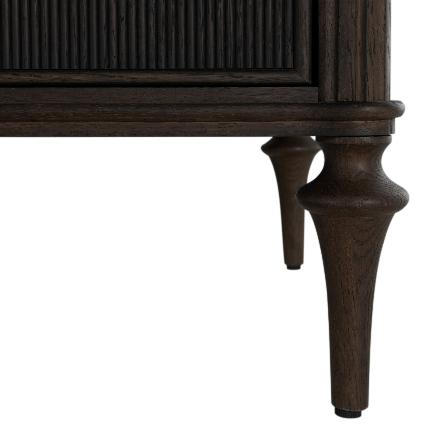 The Andrea Chest offers a refined transitional design, inspired by the classic Louis XVI commode but with a modern twist. Its dark oak finish, pencil ribbed drawer fronts, and unique antique brass keyhole cover bring timeless sophistication to any space. Crafted from high-quality oak, the chest features elegant proportions and finely designed legs that elevate its presence. The three spacious drawers provide ample storage, while the antique brass accents complement the rich, dark brown stained wood, making the Andrea Chest a versatile and stylish addition to both traditional and contemporary interiors.