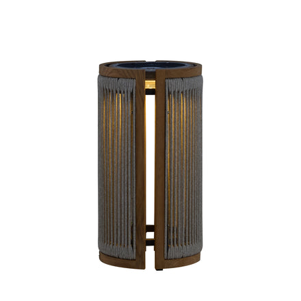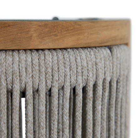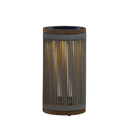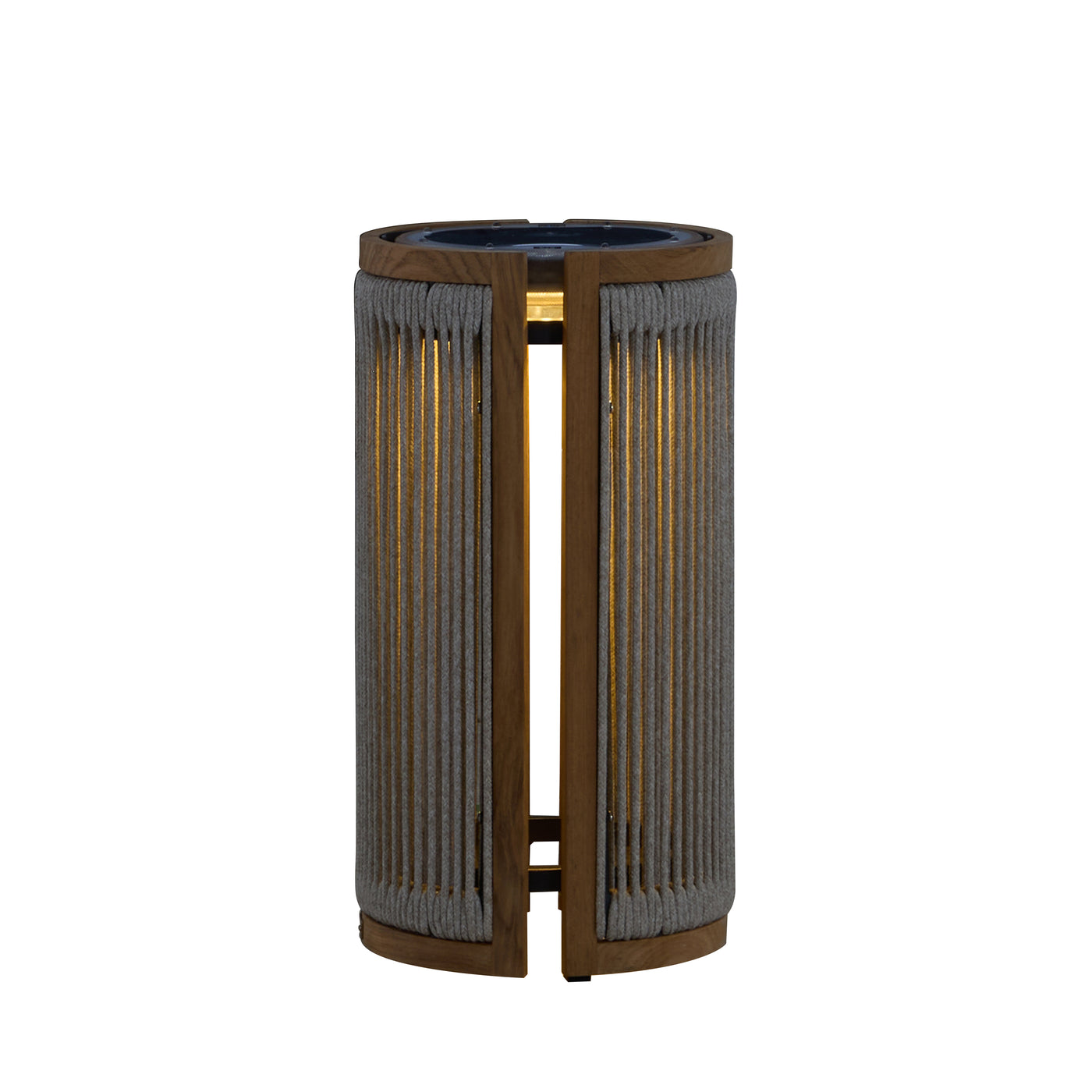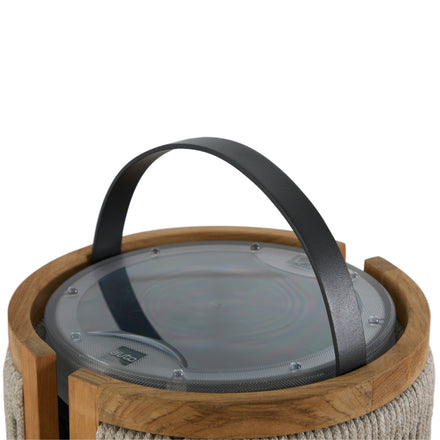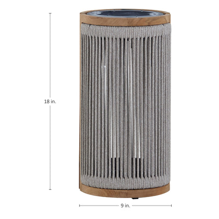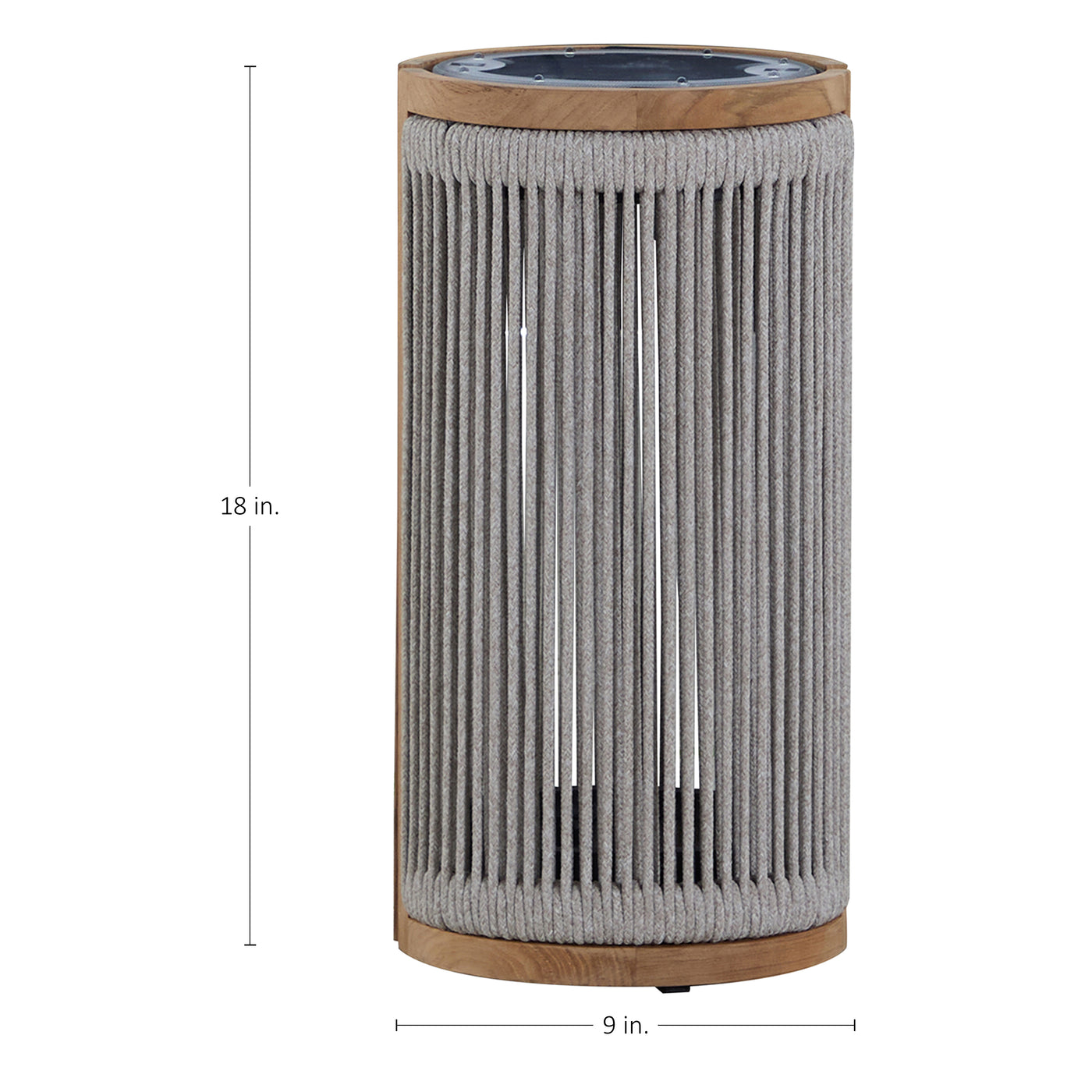 Balanced in scale and rich in texture, the Avalon Medium Lantern brings versatile light and timeless style to outdoor spaces. Made from sustainably sourced teak and handwoven olefin rope, it shares the same refined materiality as the Avalon Collection. Its integrated LED module, housed at the top, offers multiple brightness levels, touch or remote control, and can be powered by solar energy or a direct charge. With no candles or glass required, it offers safe, ambient light with modern convenience. Ideal for side tables, step lighting, or layered groupings with other lantern sizes, this mid-height design adds warmth and elegance to a variety of outdoor settings.