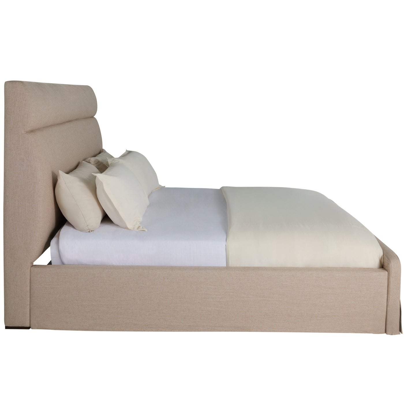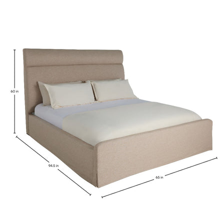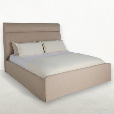 Effortlessly comfortable and timeless, the Bella Queen Bed features a mahogany frame wrapped in Slipaway Sand performance fabric for a soft, tailored finish. The generously cushioned headboard, standing 60 inches tall, adds a cozy, sculptural touch that invites relaxation. Its minimalist design and rounded corners make it ideal for modern or casual interiors, while the adjustable slat height offers versatility for those who wish to use or forgo a box spring. Both beautiful and practical, the Bella embodies easy elegance.