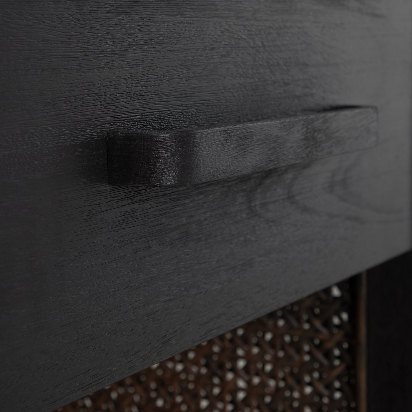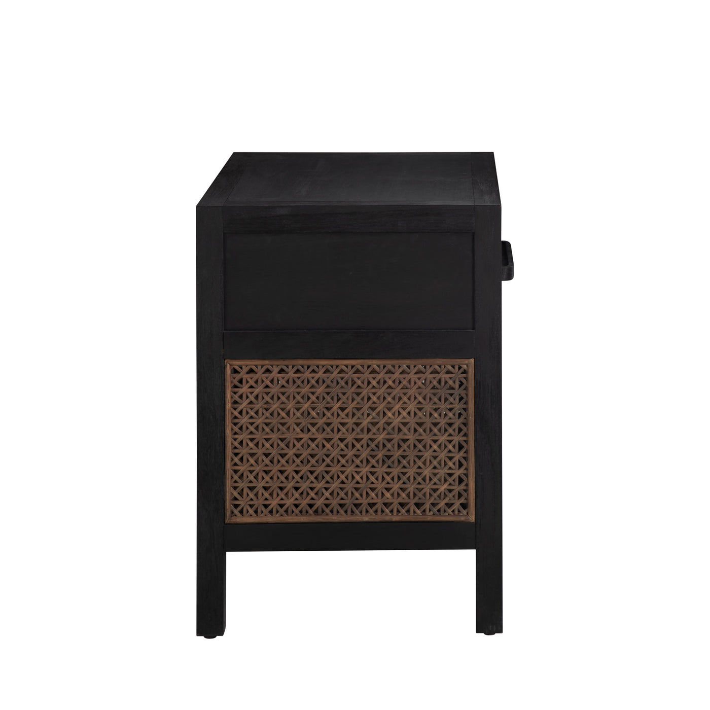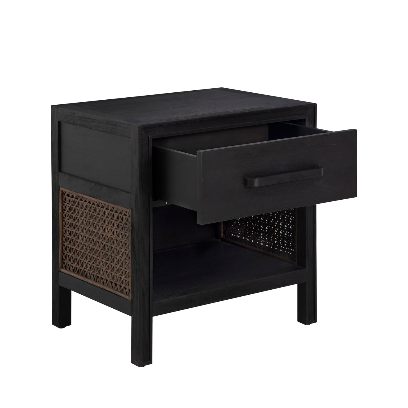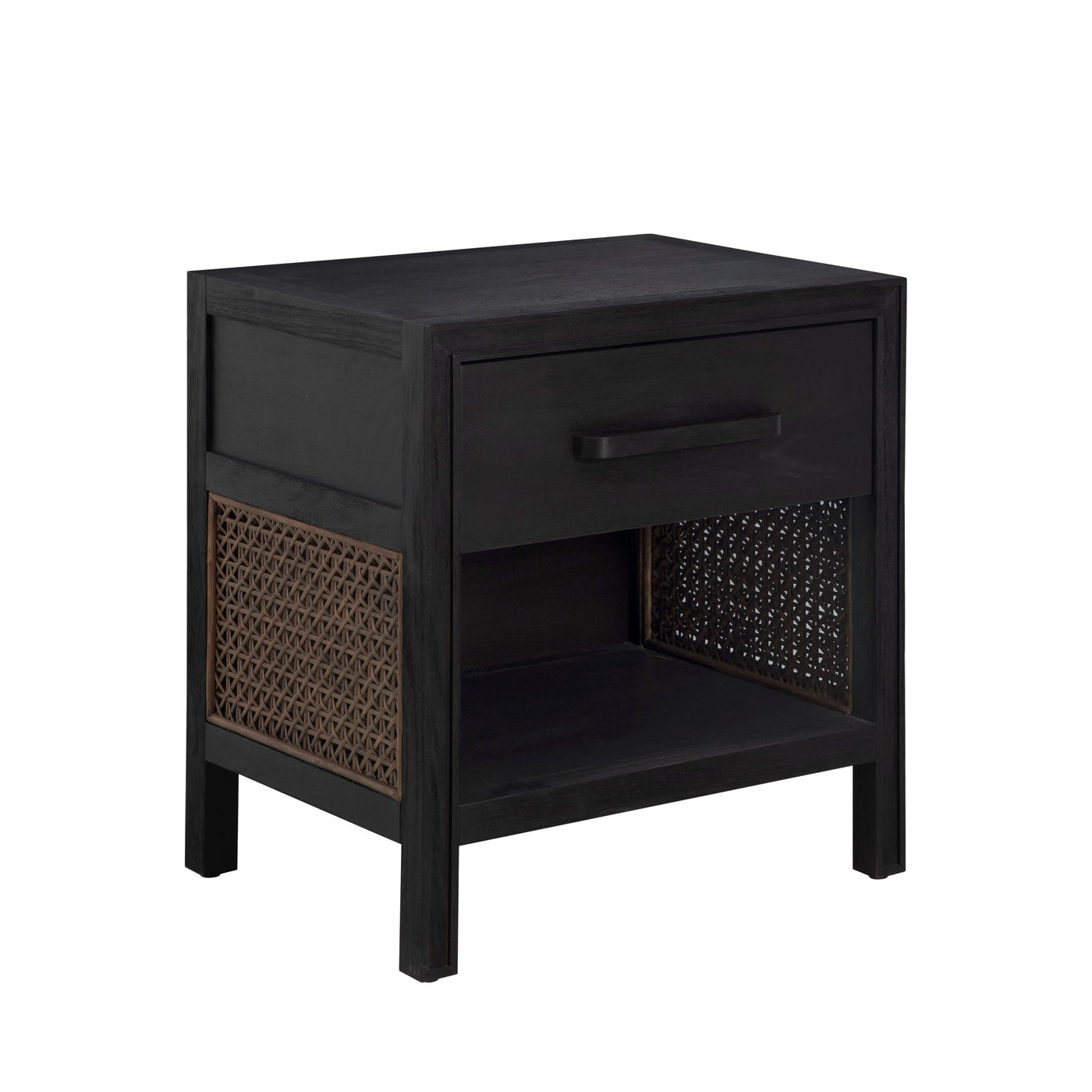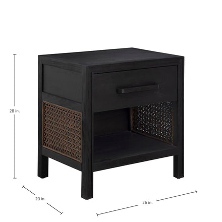 The Camille Nightstand offers a bold, modern interpretation of natural texture and form. Made from mindy wood and wicker, its rich finish reveals subtle grain details beneath the dark tone, creating depth and dimension. Handwoven rattan side panels add an artisanal and warm contrast, blending timeless craftsmanship with contemporary design. The soft-close drawer provides hidden storage, while the open bottom shelf adds everyday functionality. Designed to complement the Camille Bed and Dresser, this nightstand brings sophistication and balance to any bedroom setting.