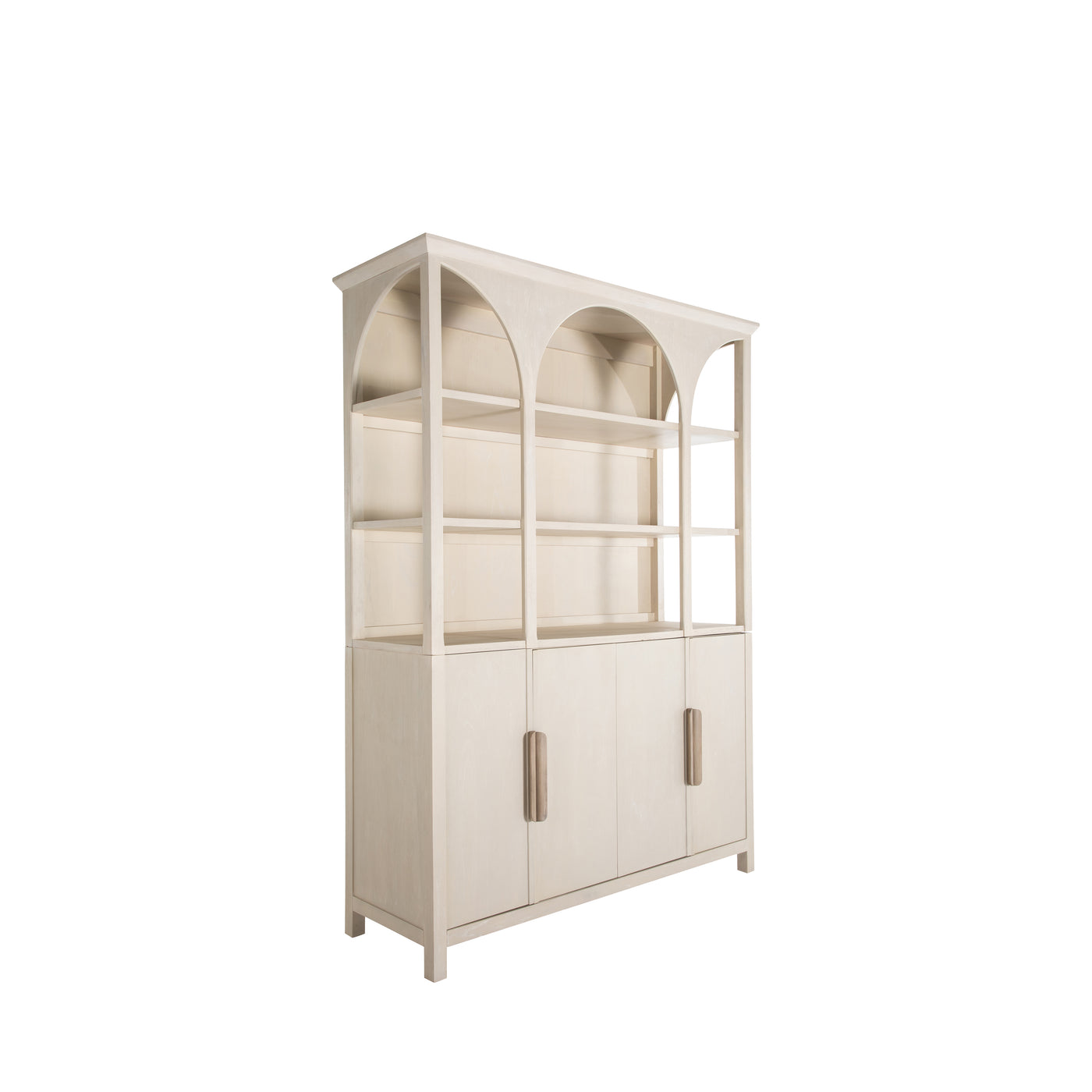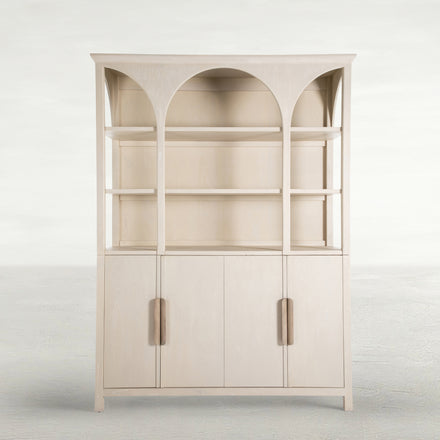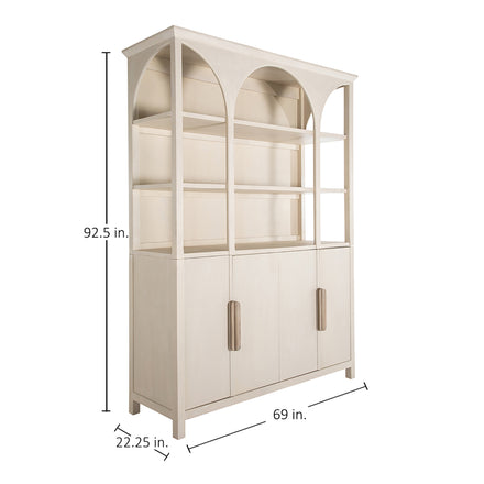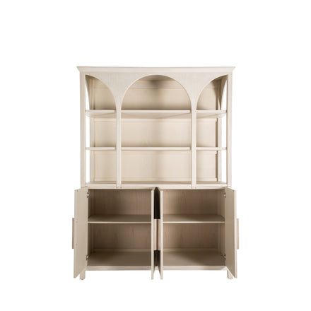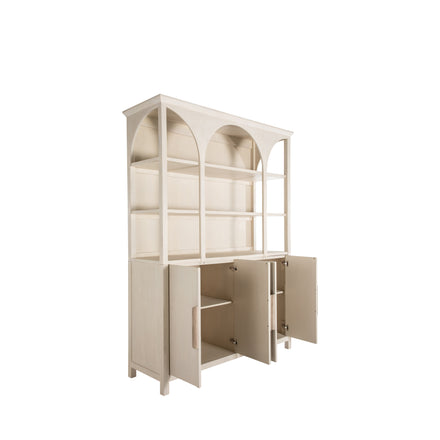 The Edison Cabinet exudes a stately elegance with its graceful arches and timeless appeal. Its style blends classic design elements with modern simplicity, featuring a serene sesame finish that complements any interior color palette. The Edison Cabinet's generous size and open shelving offer a splendid display space for books, decorative items, or treasured mementos, inviting homeowners to create a personalized showcase. Below, enclosed cabinets provide concealed storage, ideal for organizing household essentials out of sight, making it a versatile addition to a living room, dining area, or home office. The combination of display and storage makes the Edison Cabinet a multifunctional piece that is as practical as it is beautiful, ensuring it's not just a furniture piece but a central feature of a home's design and organization.