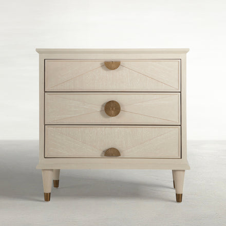 The Emberly Nightstand offers a unique blend of modern design and classic elegance. Finished in a sophisticated cerused white, this nightstand is crafted from high-quality mindy wood and oak veneer, accented with metal details. It features three spacious drawers, providing generous storage space for your bedside essentials. The metal geometric-patterned drawer fronts, in a stylish and detailed round design, adds a touch of contemporary flair, making the Emberly Nightstand a standout piece in any bedroom decor.
