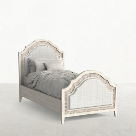 The Grand Bermuda Classic Twin Bed in Whitewash captures the essence of coastal serenity with its graceful arched headboard and footboard, each framed in textured Banana Leaf Rope and accented by raffia-inspired panels. Crafted from Sungkai wood in a soft Whitewash finish, this bed embodies the Grand Bermuda collection’s vision of blending indoor comfort with outdoor tranquility. The 63-inch-high headboard creates a statement of relaxed elegance, while the natural materials and layered textures evoke a breezy, organic feel. Available in King Queen and Twin sizes, this bed brings an elevated yet effortless island aesthetic to any bedroom.