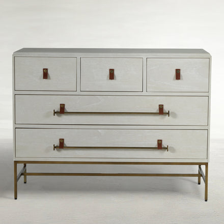 Brand Gabby Certifications and compliance Prop 65 Lead Country of origin IDN Contract viable Yes Finish family White Hardware finish Cerused White|Stained Brass Inner frame material Wood Joinery type Dowel/Block Screw & Glue Material Genuine Leather, Iron, Mindi Veneer Media compartments No Natural material disclosure Natural, Handmade Number of drawers 5 Storage type Drawers Wood species Mindy Wood tone Natural