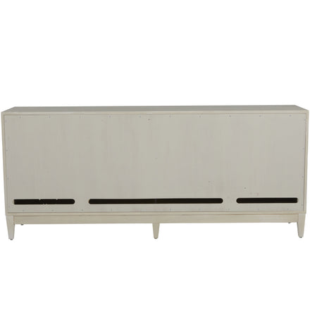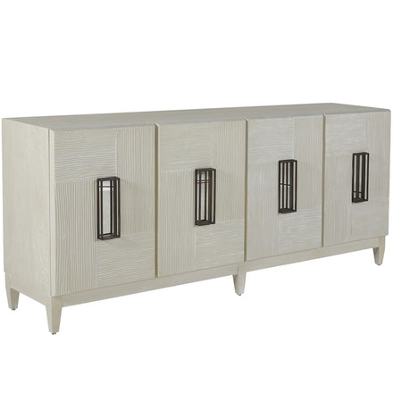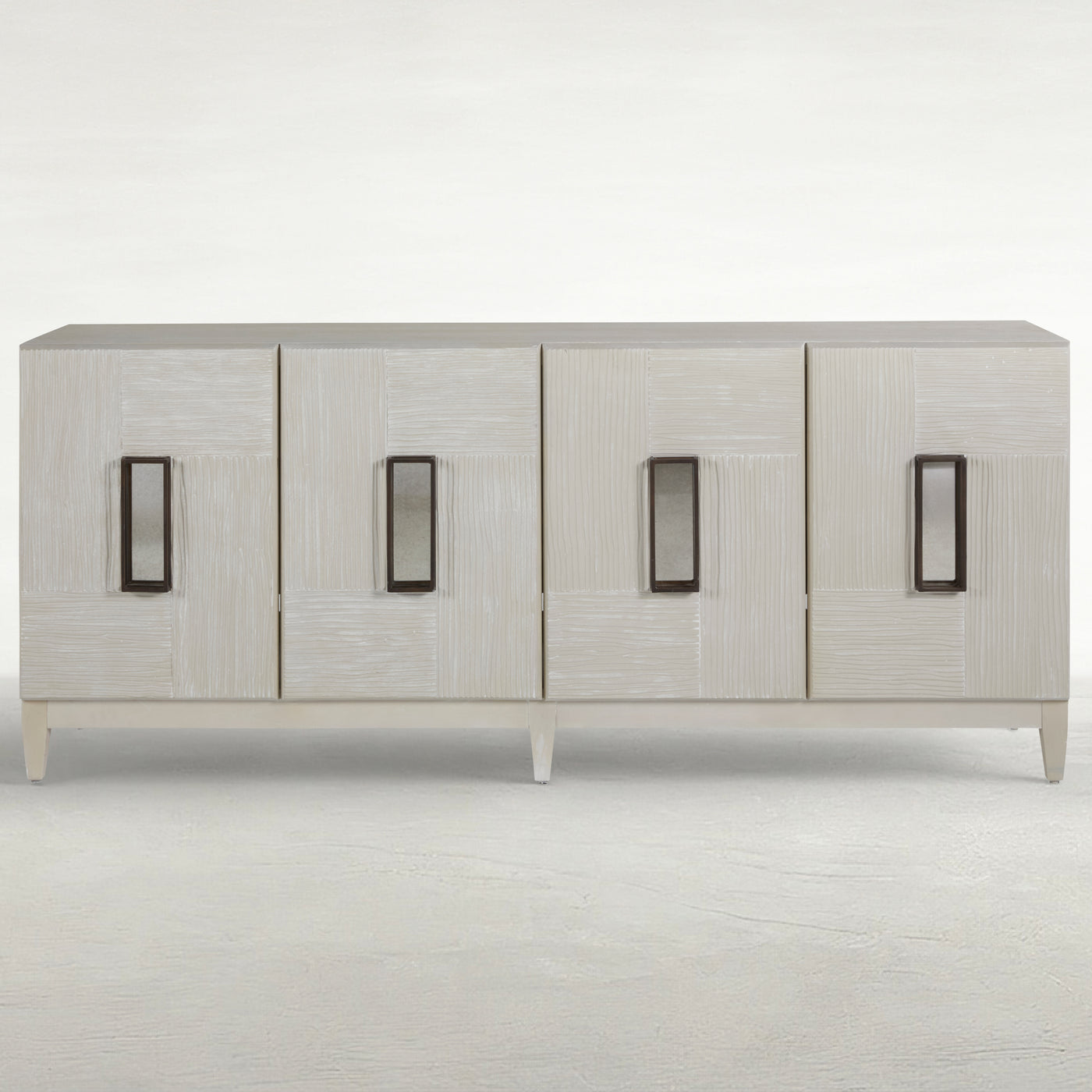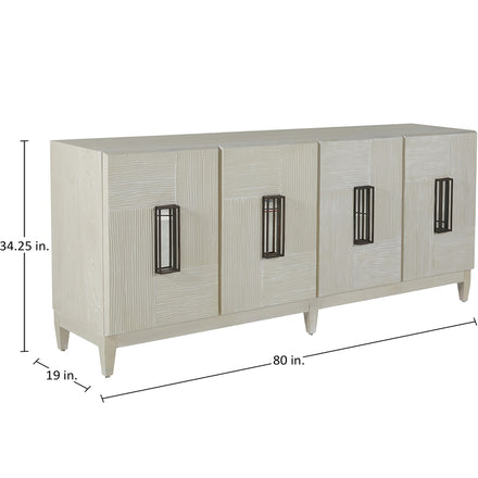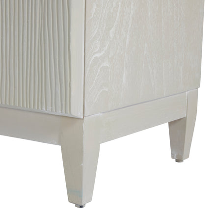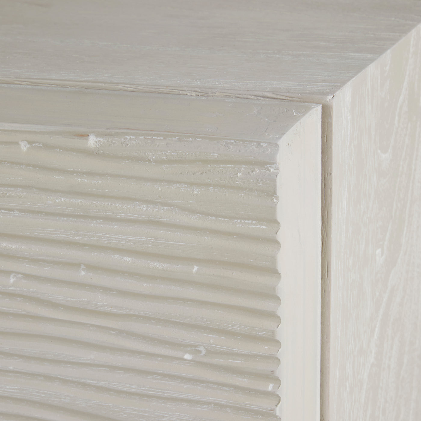 The Tilden Cabinet features a minimalist silhouette with a busy facade and a light finish, perfect for modern interiors. Its eye-catching carved facade with fine linear grooves that enhance its visual appeal adds depth, transforming it into a contemporary statement piece. Inside, adjustable shelving offers versatile storage, while the top surface is ideal for decor or essentials. Designed for functionality, it includes soft-close doors and cord management, suitable for use as a stylish organizer or media console.