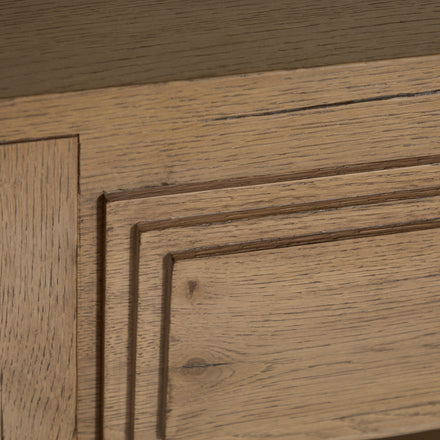The Wren Nightstand in Dawn offers warmth and utility in a minimalist form. Constructed from oak with a rustic finish that celebrates the wood’s natural variations, it features one soft-close drawer framed with carved border detailing and an open shelf below for storage or display. The Mountain Bronze handle complements the design’s understated elegance while adding a modern edge.