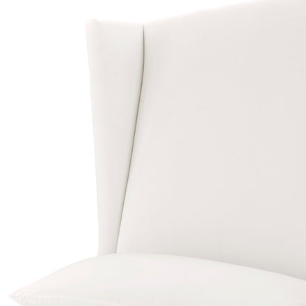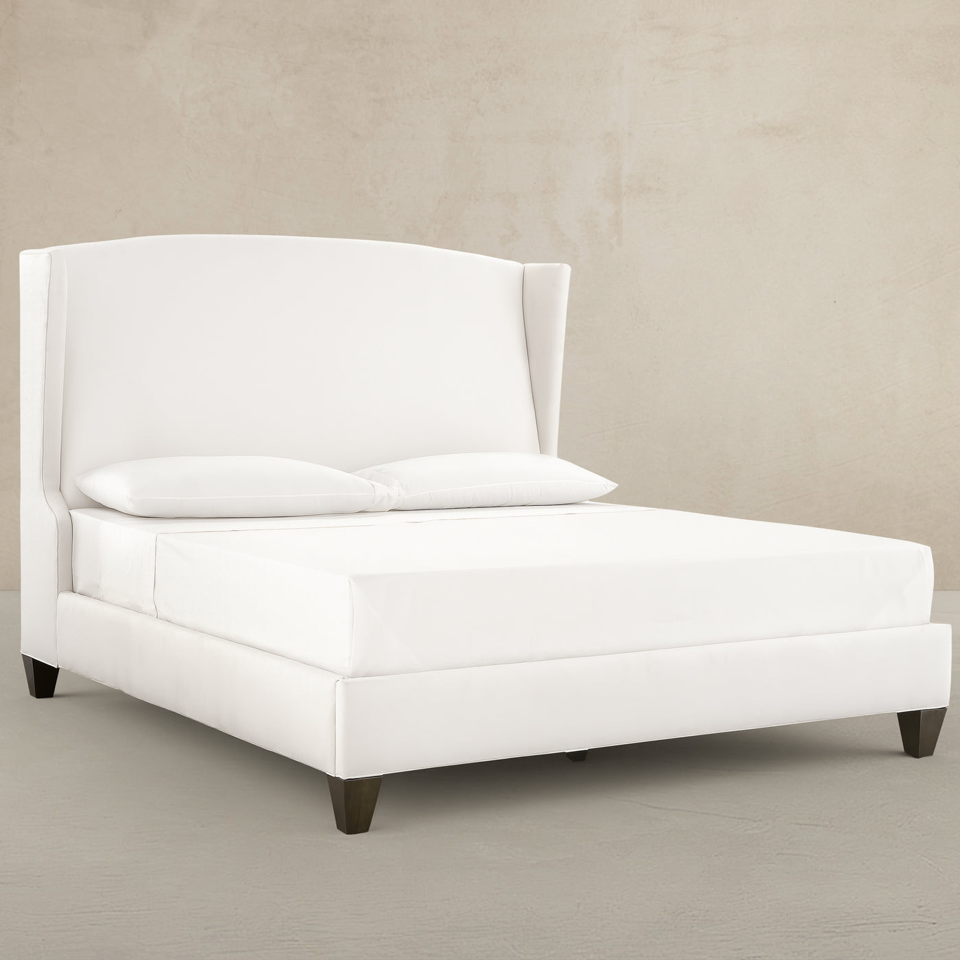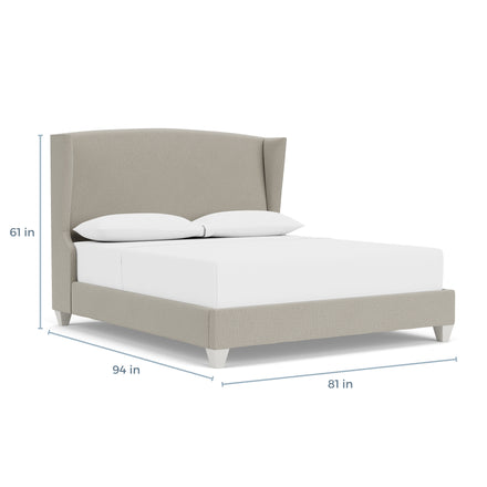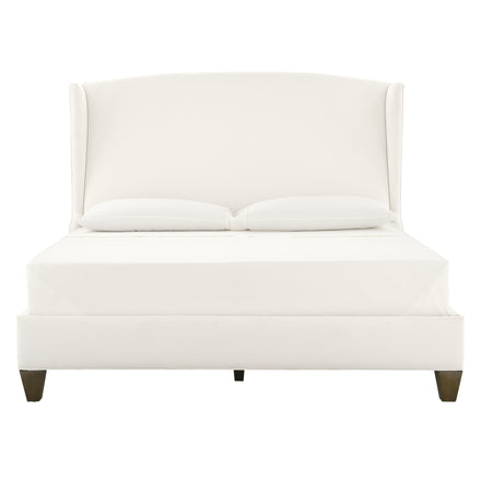 Introducing the Cassy Bed, featuring a sophisticated design with clean lines and a gently curved headboard, creating an elegant focal point for any bedroom. Fully upholstered, the Cassy Bed promises both style and comfort for any decor style you choose. The sturdy dark wooden legs add a touch of refinement, making it a perfect blend of contemporary and classic design elements. Ideal for those seeking a luxurious sleeping experience. Available in both king and queen sizes, and optional nailhead design.
