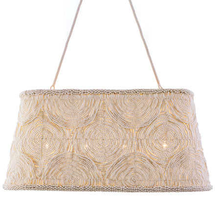 The Angelina Linear Chandelier is a stunning centerpiece that elevates large dining or gathering spaces with its elegant, sustainable craftsmanship. Handcrafted by women artisans, it features intricate beaded strands made from sun-dried coconut shells. Its elongated, curved silhouette is perfect for rectangular dining tables or open-concept spaces, admired from multiple angles. The natural tones and delicate circular beaded patterns blend texture and elegance, transforming any room. Beyond illumination, it sets the mood for gatherings and supports artisans committed to sustainable, handmade artistry.