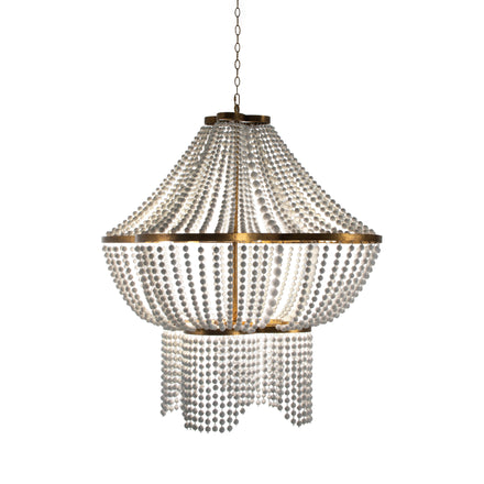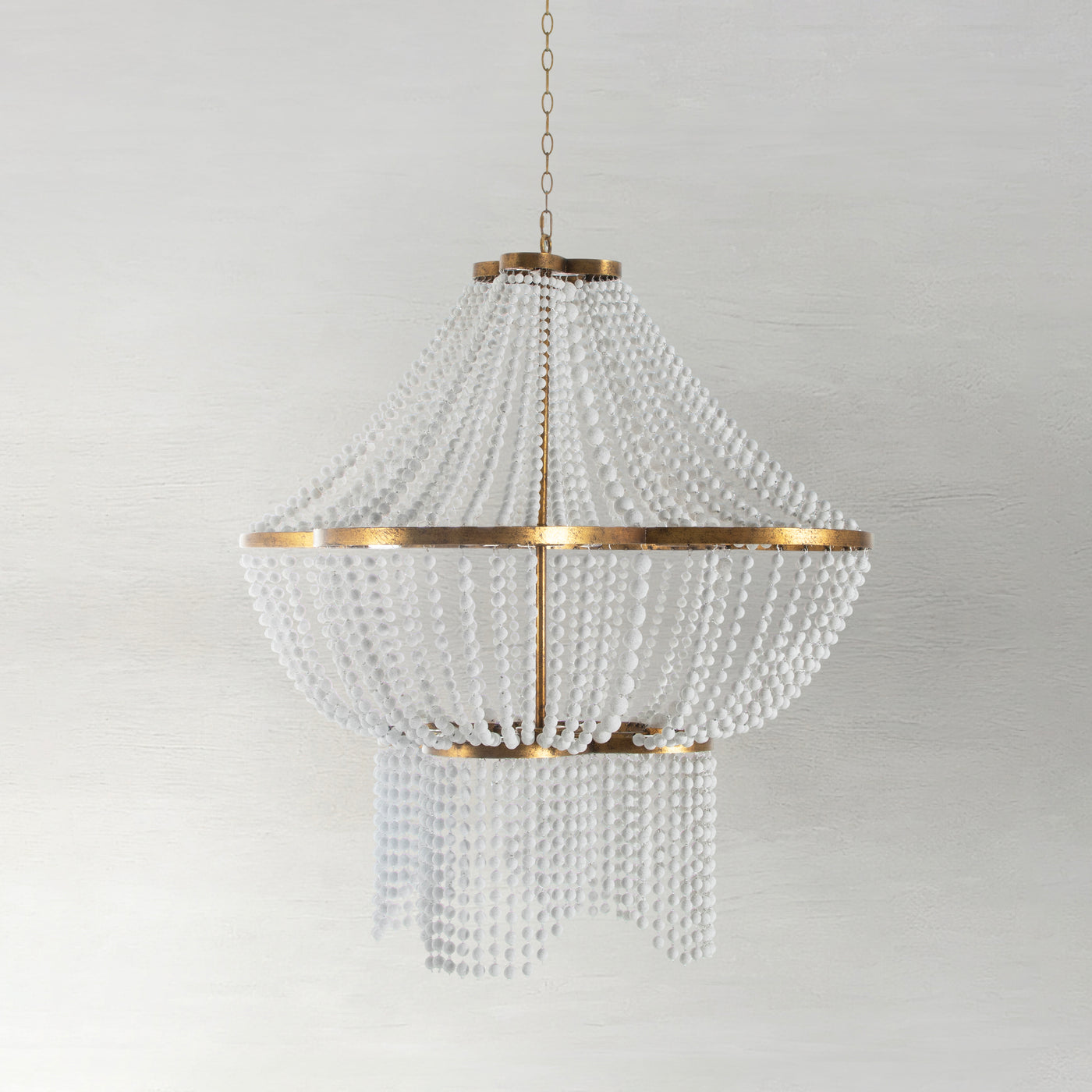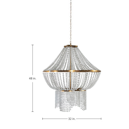 The Annabelle Chandelier is a stunning statement piece, blending vintage charm with modern elegance. Crafted with cascading strands of antique white beads in a quatrefoil, it exudes a soft, luminous glow that transforms any space into a luxurious retreat. The chandelier is beautifully accented with gilded gold metal detailing, adding a touch of sophistication and warmth to its design. Perfect for dining rooms, entryways, or living areas, the Annabelle Chandelier creates an inviting ambiance while serving as an eye-catching focal point.