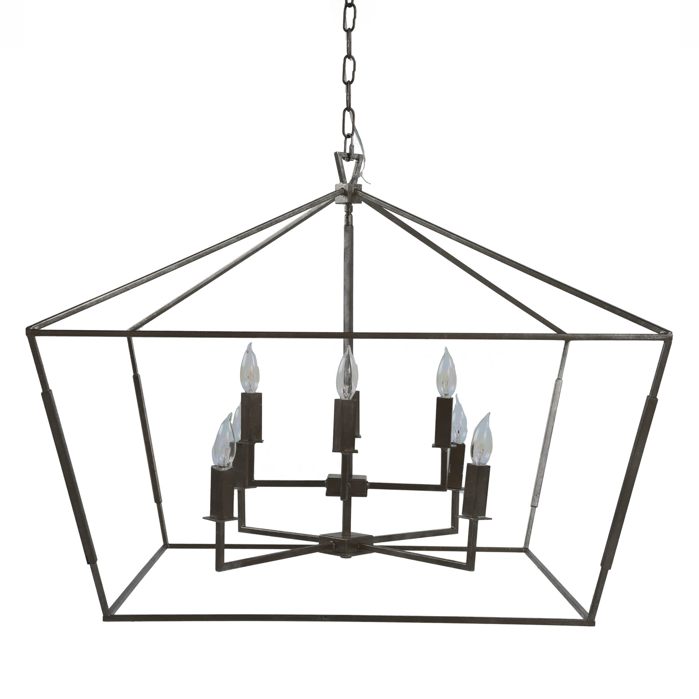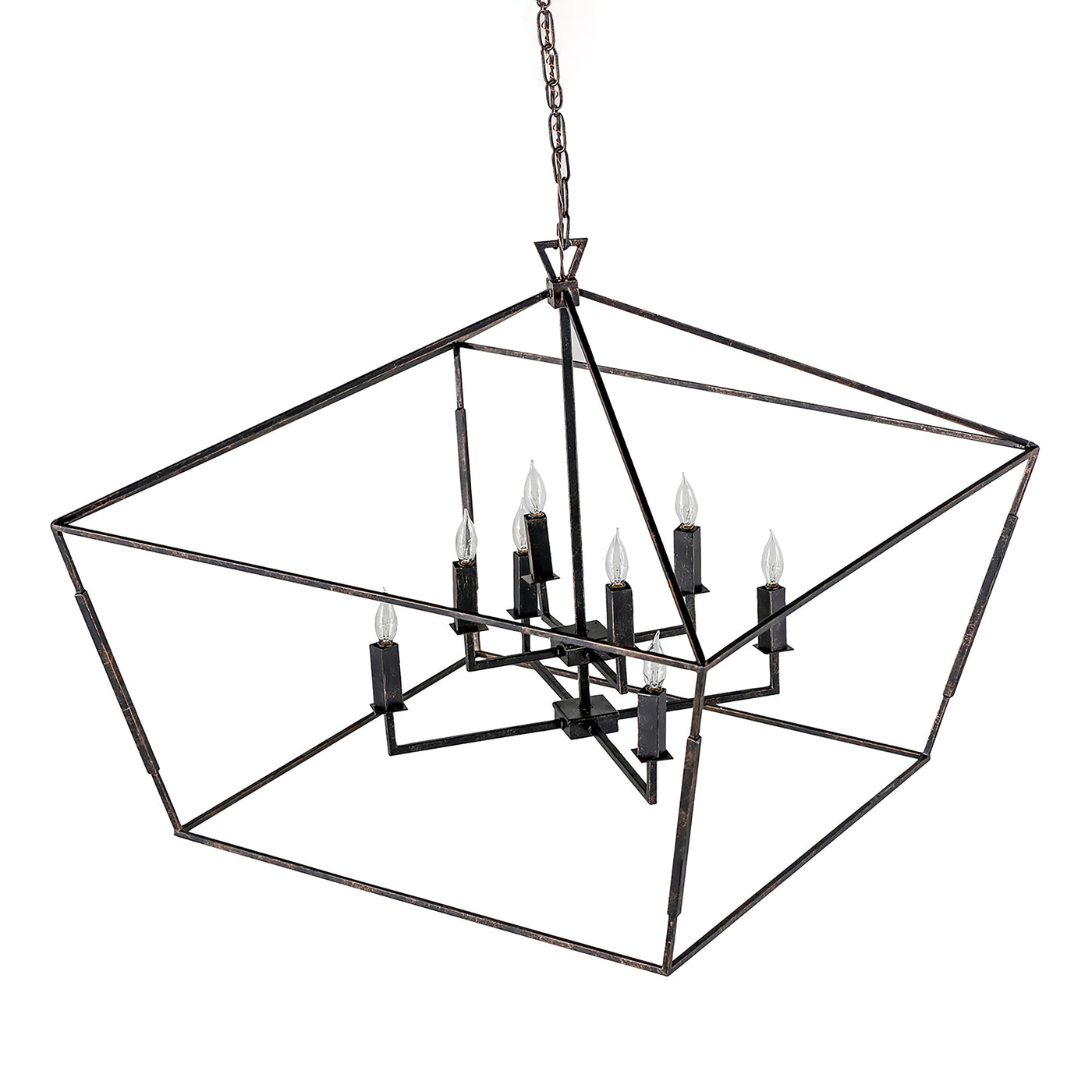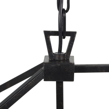 The Arnold Chandelier features a modern industrial design with straight lines and compelling angles, bringing a modern touch to a classic lantern style. Made from metal and hand-finished in antique bronze, this chandelier exudes sophisticated elegance. With eight bulbs, it provides ample lighting while enhancing the ambiance of any space. Ideal for dining rooms, entryways, or living areas, the Arnold Chandelier is a striking fixture that combines contemporary style with timeless charm.