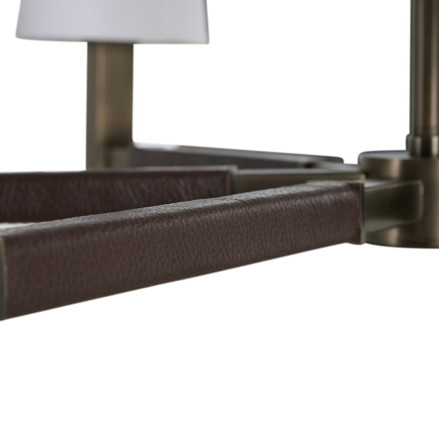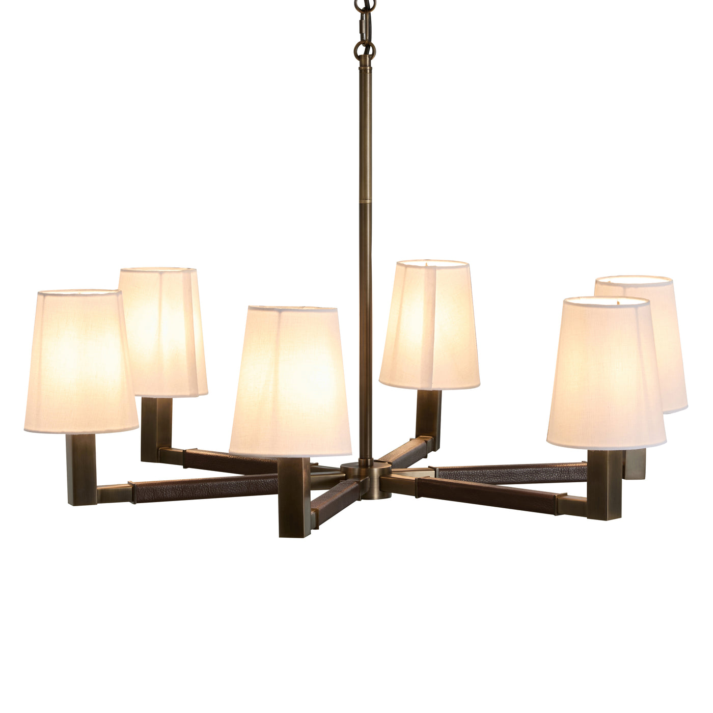 The Glenbrook Chandelier exudes understated sophistication with its blend of rich materials and balanced design. Crafted from mild steel in a warm Mountain Bronze finish, its six gracefully extended arms are wrapped in Dark Brown Leather, adding a layer of tactile luxury. Each arm supports a soft white shade that gently diffuses the light, creating an inviting glow that complements both modern and traditional interiors. With its thoughtful mix of metal, leather, and light, the Glenbrook brings a sense of refined warmth and quiet elegance to dining rooms, entryways, and living spaces alike.