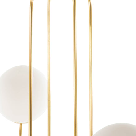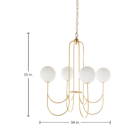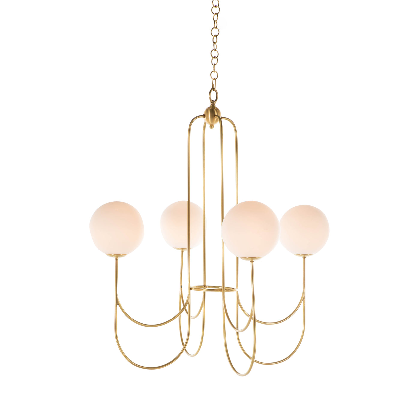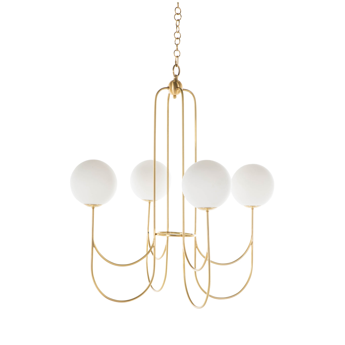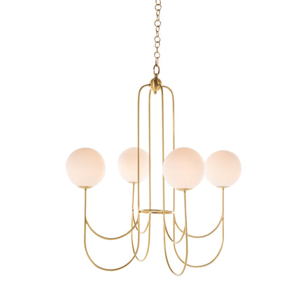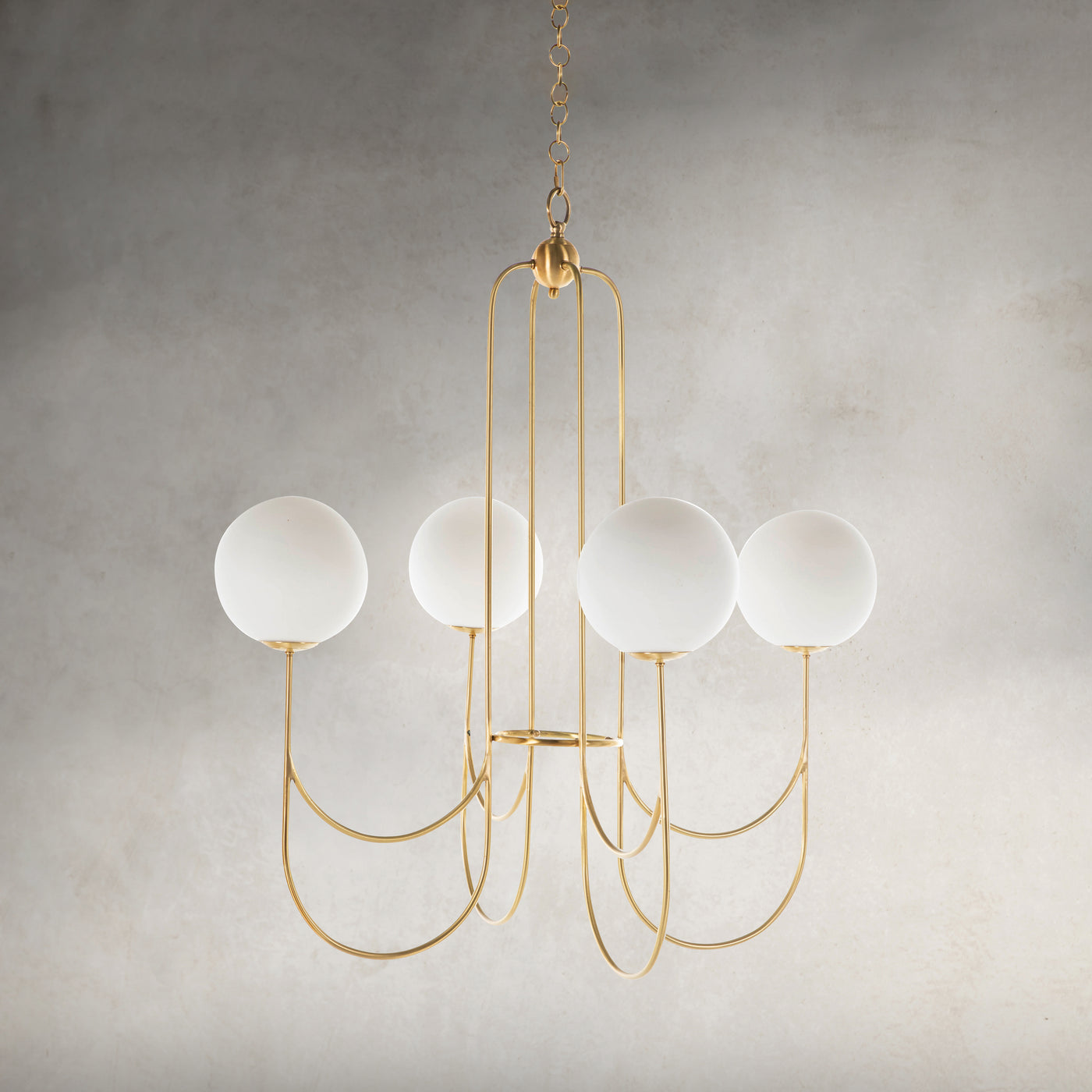 The Granville Chandelier is a modern, elegant centerpiece featuring four sweeping double arms ending in frosted matte glass orbs. Its dramatic art deco design with a brass finish adds a touch of luxury while blending seamlessly with various interior styles. The frosted glass orbs provide a soft, ambient glow, making it perfect for dining rooms, living areas, or entryways. This chandelier's blend of bold lines and delicate curves creates a versatile and timeless addition to any decor.