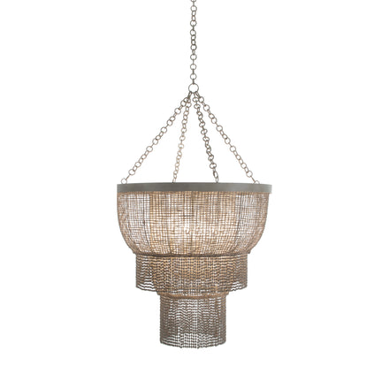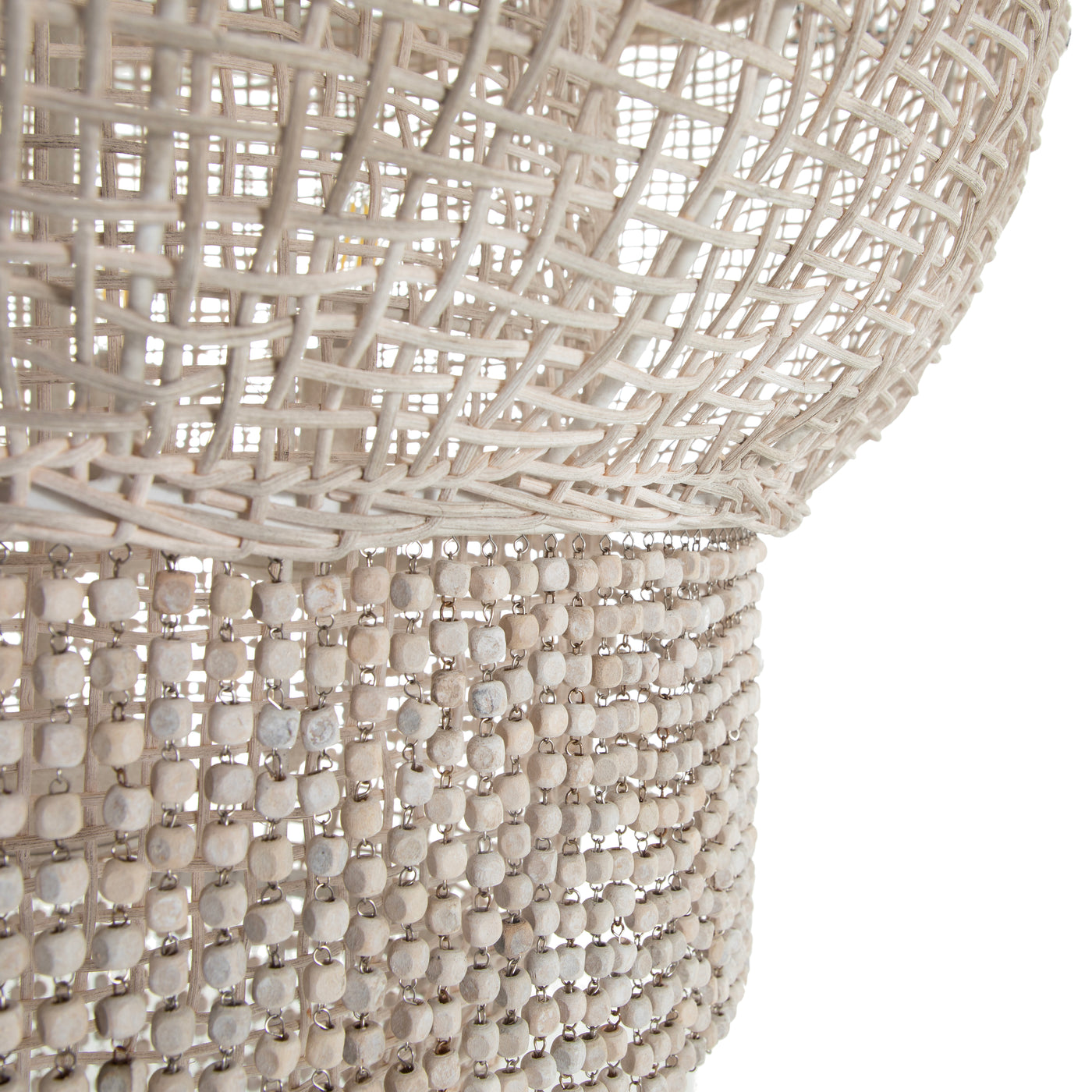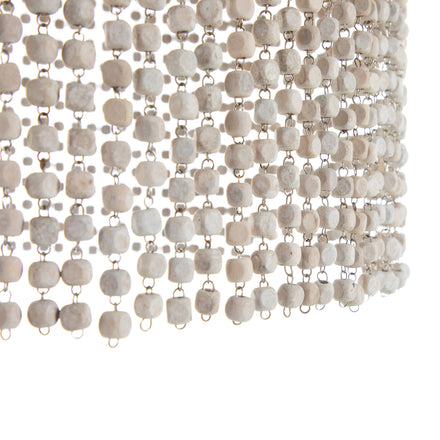 The Halia Chandelier exudes an antique charm with its white-wash finish, enhancing any space with a touch of vintage elegance. It's style blends rustic and bohemian elements, making it versatile for various interior design themes. The chandelier features hanging beads that are imperfectly shaped, adding character and uniqueness to the piece. Beneath the cascading beads lies a sturdy rattan frame, ensuring durability while maintaining a light, airy aesthetic. This chandelier is a perfect statement piece, bringing both style and personality to your interior decor.