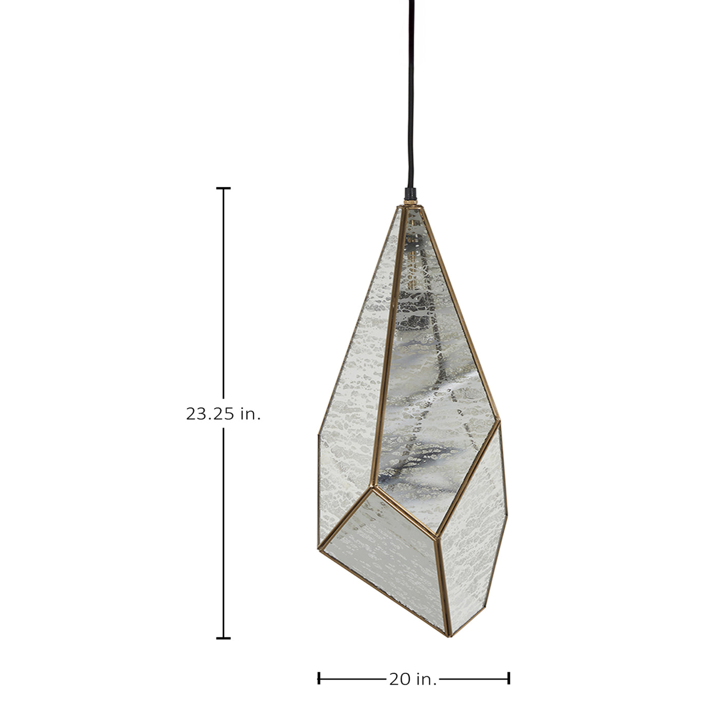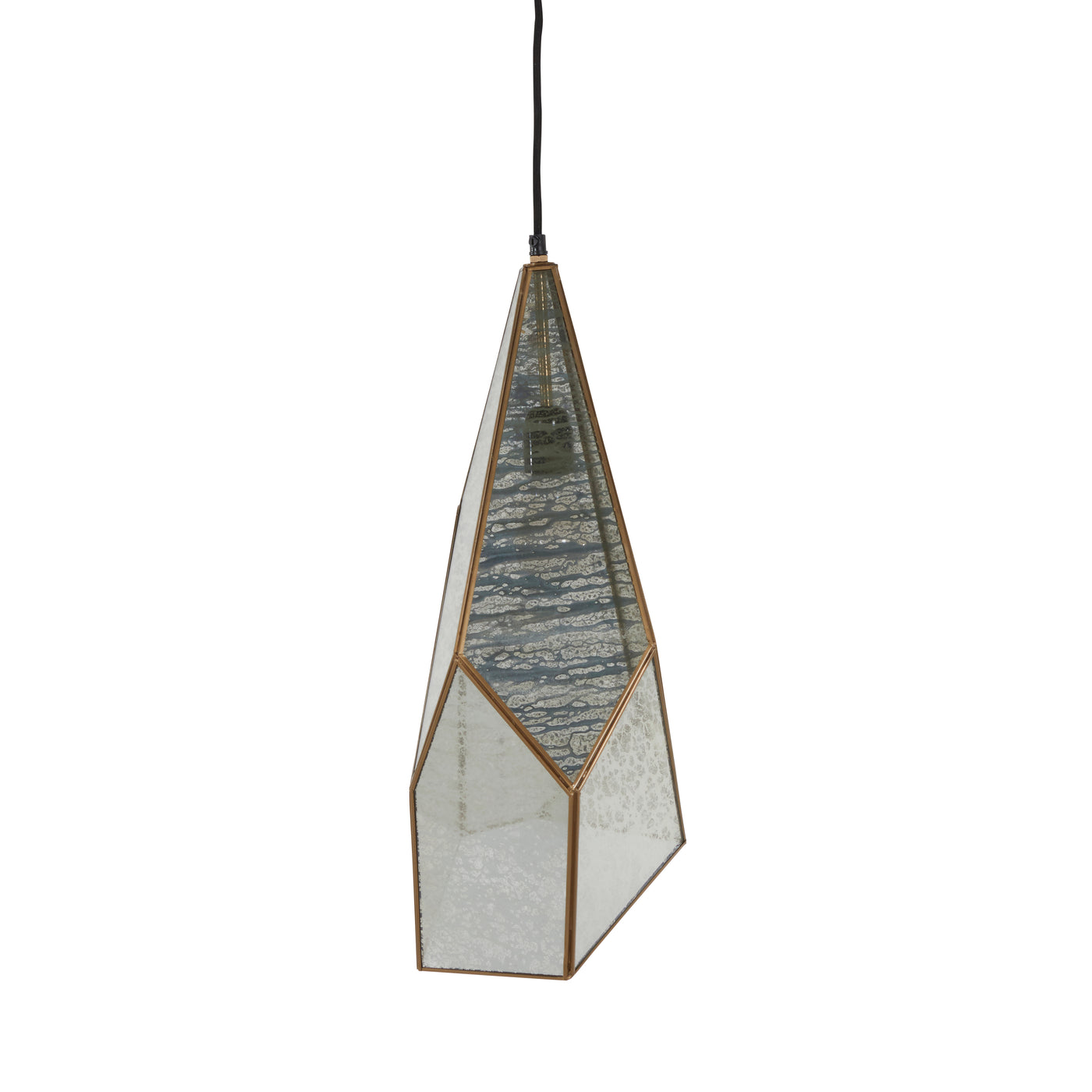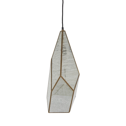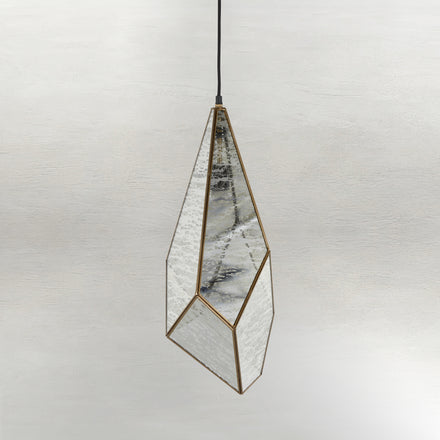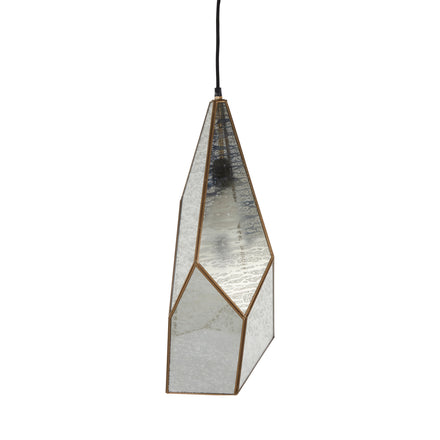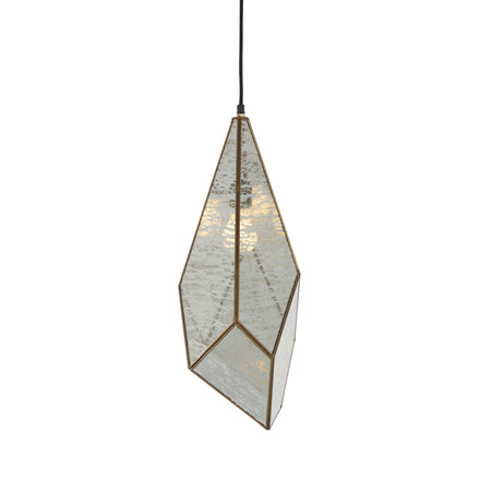 The Mara Pendant light features an elegant combination of antique brushed brass and silver mercury glass. Its unique geometric design adds a contemporary touch. Crafted from glass and iron, this pendant light has a single candelabra base bulb providing a warm glow. The pendant uses a black wire for a sleek and minimal appearance. Ideal for dry locations, the Malia Pendant brings a stylish and sophisticated lighting solution to your home.