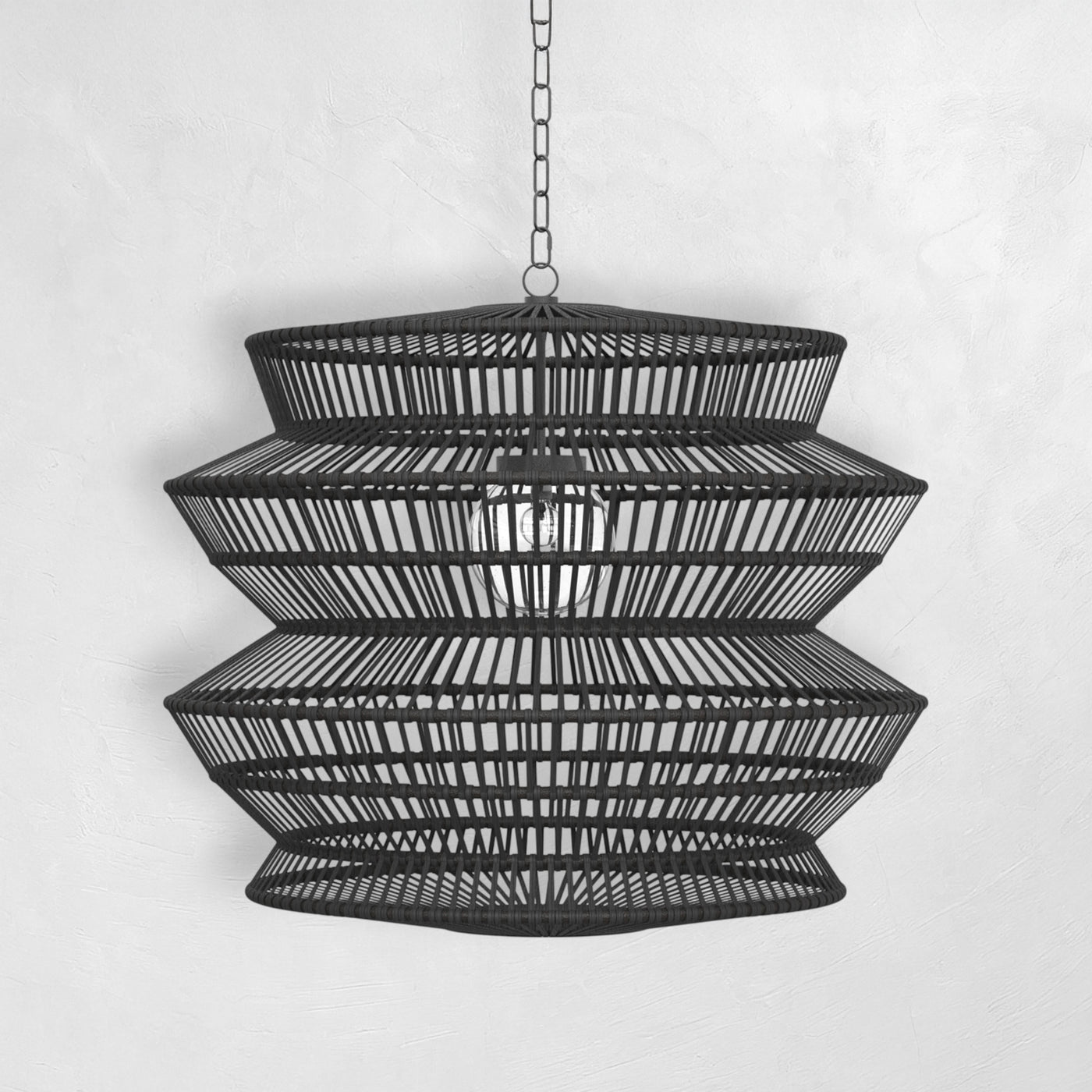 The Mckenna Outdoor Chandelier Large, measuring 34"x34"x27", features a modern, geometric design with its layed hexagonal shap. The natural texture added by the handwoven resin wicker creates a harmonious blend of contemporary and organic elements. Designed to withstand outdoor conditions, its UL Wet certified, making it suitable for locations with direct water exposure. This elegant chandelier features a wrought aluminum frame handwoven with our N-Dura™ resin wicker, ensuring durability and a sophisticated aesthetic. It includes a 12' chain for versatile hanging options and requires a single light bulb with up to 100W for illumination, blending functionality with stylish design for any outdoor space.