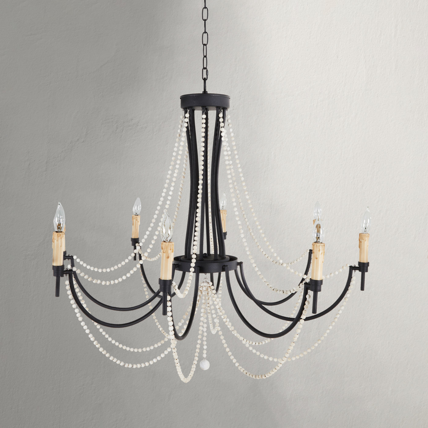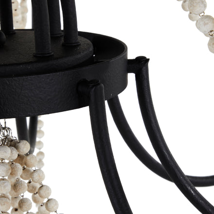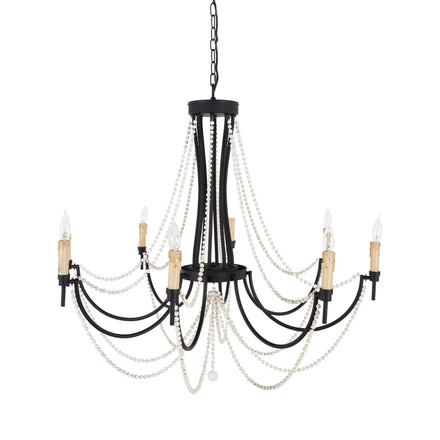 The Percy Chandelier combines contemporary style with a touch of glamour. Its distinguished Empire frame, finished in rusty black, is elegantly enveloped in strands of distressed ivory wooden beads. This contrasting two-tone design adds depth and demands attention, making the Percy Chandelier a perfect centerpiece for dining rooms, living areas, or entryways. The chandelier's unique blend of materials and finishes creates a bold and intriguing atmosphere, providing both ample light and visual appeal.