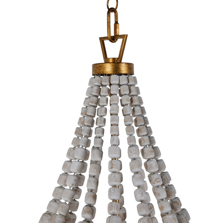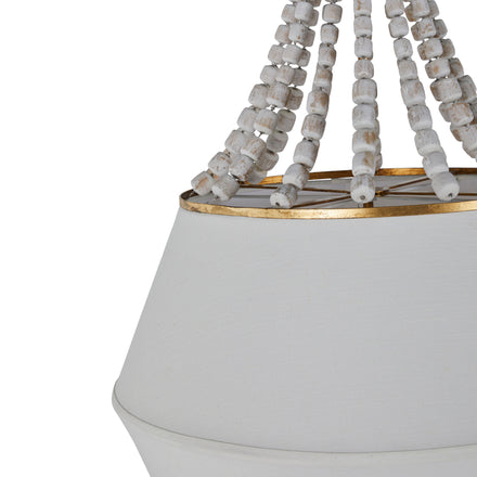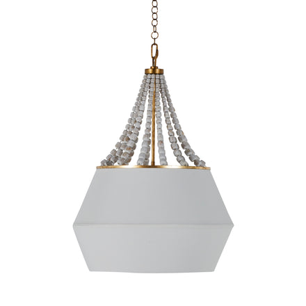 - Geometric fabric shade with whitewashed wooden beads offers rich texture and depth, making a bold and artistic lighting statement