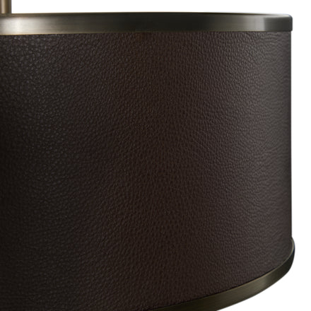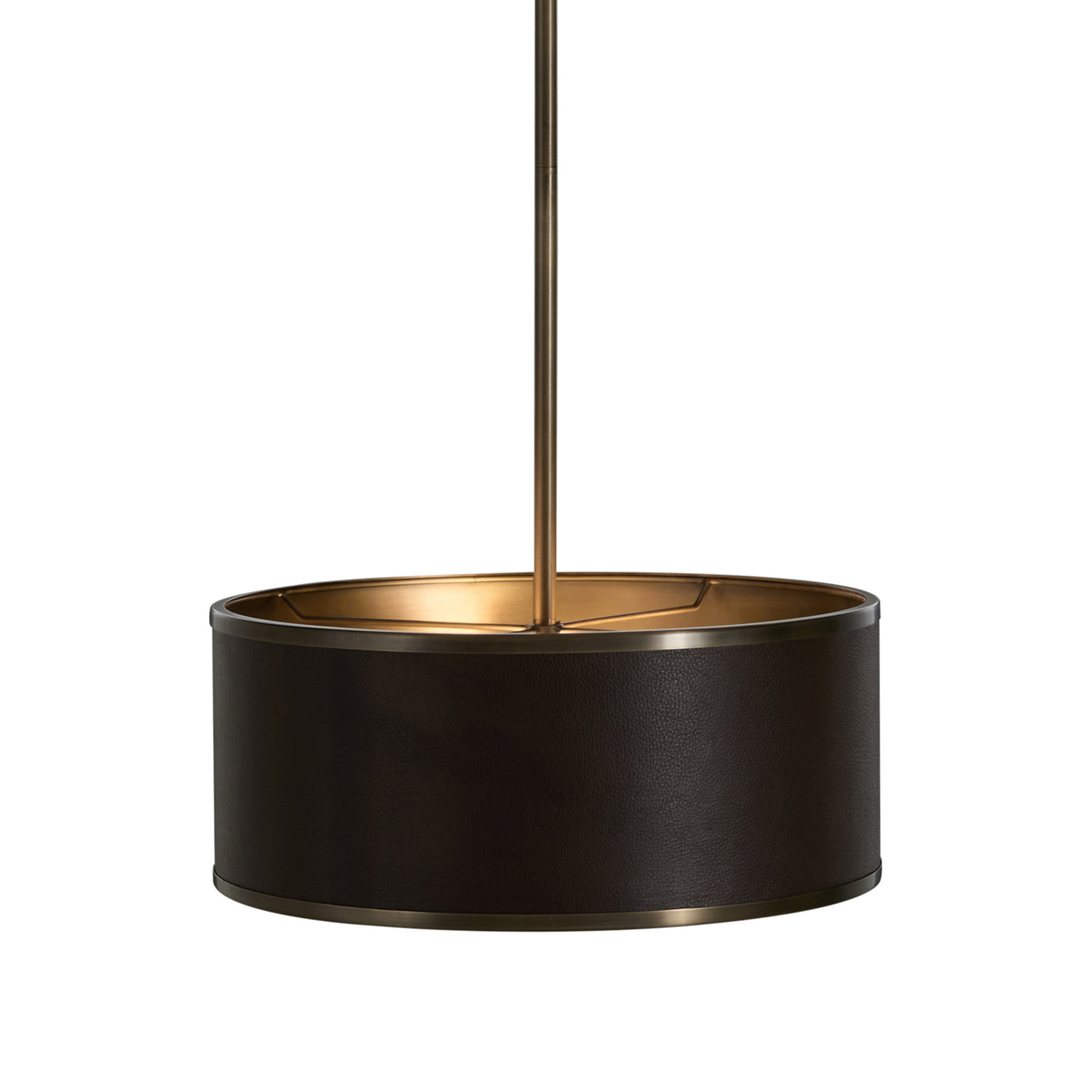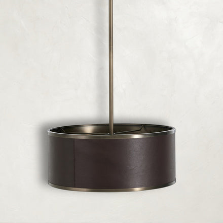 The Vistara Pendant elevates the collection with a modern yet inviting sensibility. A dark brown leather-wrapped drum shade framed in Mountain Bronze metal creates a bold statement, while the cast glass diffuser at the bottom softens the light, producing a warm, ambient glow. Perfect for dining areas, entryways, or above kitchen islands, this pendant brings depth and sophistication through its unique blend of materials and tactile details.