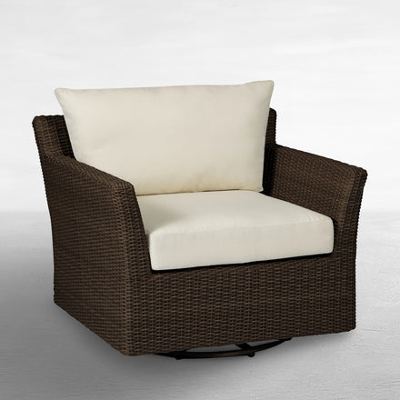 The Club Woven Swivel Glider combines comfort and functionality with a timeless design. Crafted with a sturdy wrought aluminum frame, it is handwoven with durable N-Duraâ„¢ resin wicker, ensuring weather resistance and longevity. This versatile chair features a smooth swivel mechanism that allows for 360-degree rotation, as well as a gliding motion that rocks back and forth. The plush cushions provide exceptional comfort, making it an ideal choice for relaxing in any outdoor setting. Its combination of movement and comfort, along with the elegant handwoven wicker design, makes this glider a perfect addition to patios, decks, or garden areas.