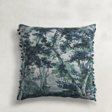 The Meadowland Blues Pillow showcases a picturesque tapestry design in calming shades of blue and green bringing a touch of nature indoors. Its detailed forest scene is complemented by charming and complementary tassels on the edges. Available with hypoallergenic poly-fiber or luxurious feather-down fill, this pillow combines comfort and elegance. Proudly made in the USA, Gabby pillows are expertly handwoven by skilled American craftsmen, offering stain-resistant finishes and available in various sizes.