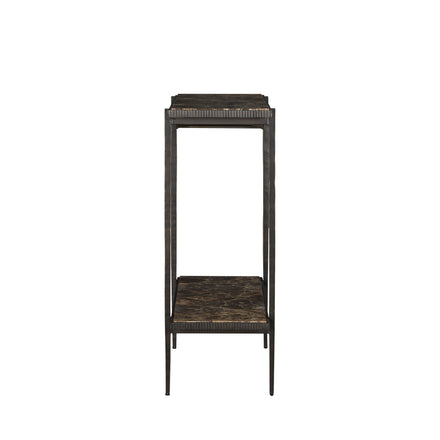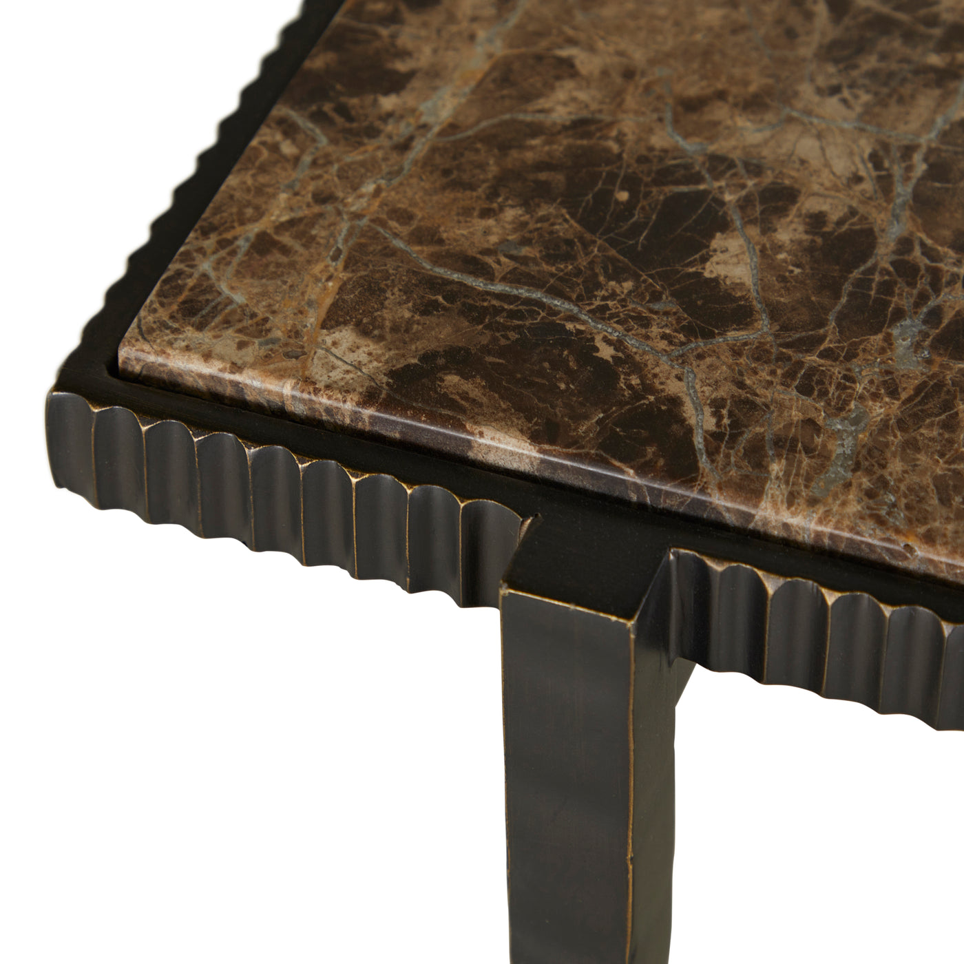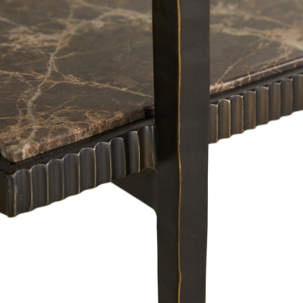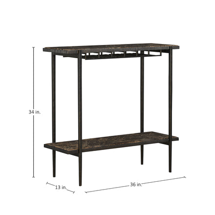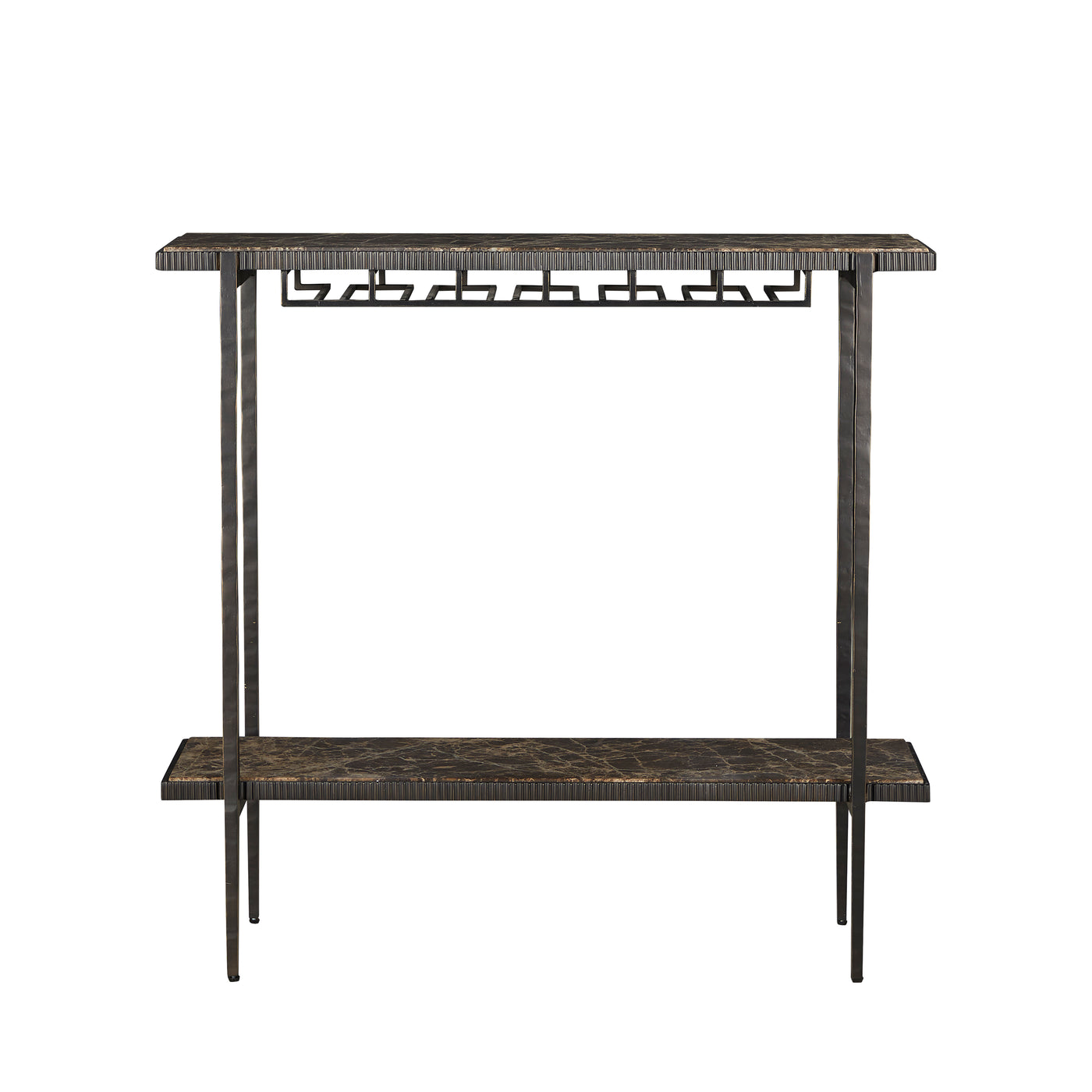 Featuring a sleek Marron Imperial marble top and a forged antique bronze frame, this slender accent bar console exudes timeless sophistication. Designed for both style and utility, the Ariana Bar Console boasts an undercounter glass storage rack, ensuring your stemware is always within reach. Its delicately forged metal details provide a refined touch, while the sturdy yet slender frame allows for seamless integration into any space - whether as a statement piece in your living room or a chic addition to your home bar setup. Perfect for hosting or everyday luxury, this bar console brings simple functionality with a high-end aesthetic, making it an essential piece for connoisseurs of fine design and entertaining.