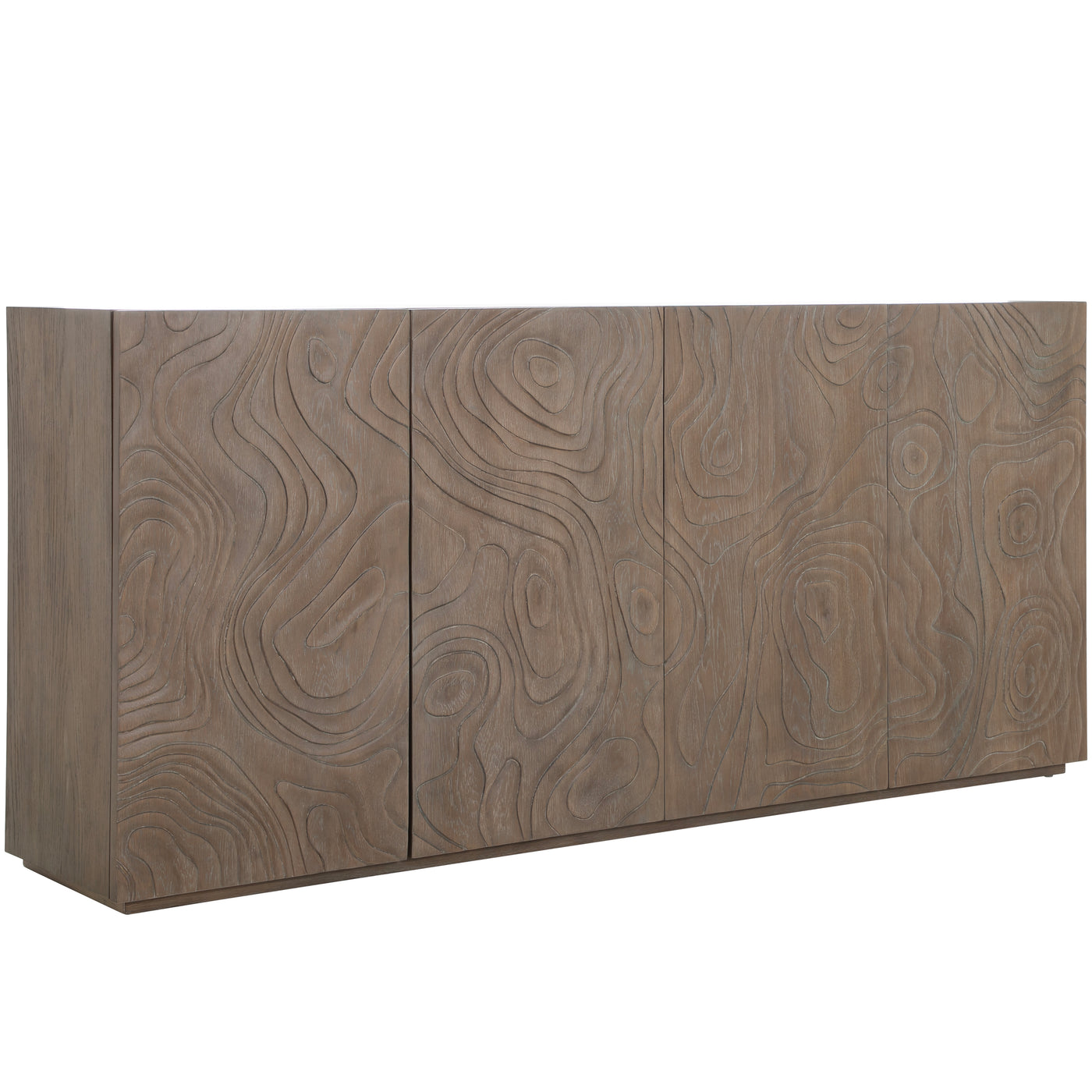 The Bingham Sideboard features a beautiful cerused natural finish for a understated yet intriguing credenza. Inspired by antique topographical maps, the sideboard features intricate wood carvings of ascending heights in an organic pattern, creating a sense of movement on the doors. Crafted from oak and oak veneer, it includes two spacious shelves behind the 4 doors, offering both fixed and adjustable options for versatile storage solutions. Perfect for a dining room, living room, or hallway, the Bingham Sideboard is a stylish and functional piece that enhances any decor with its unique aesthetic and practical design.