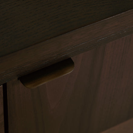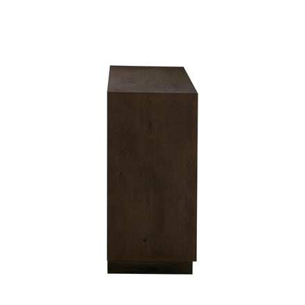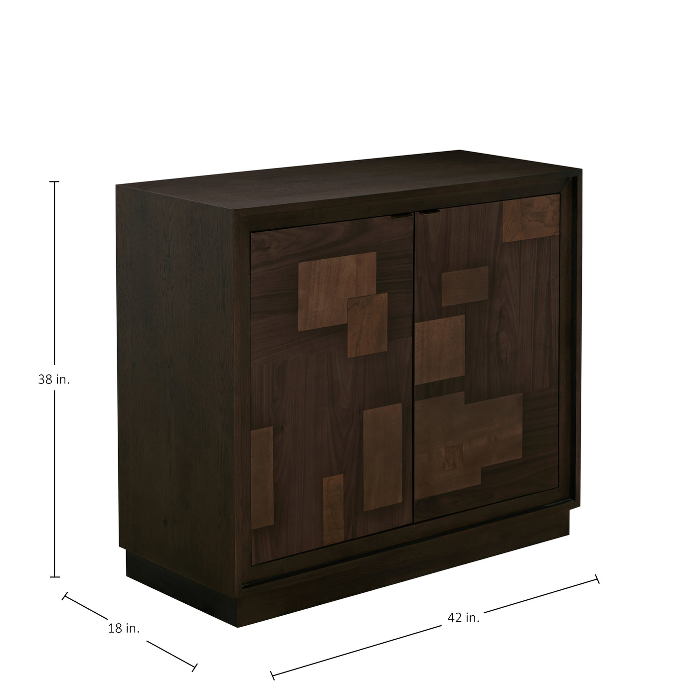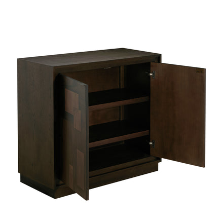 The Elwood Accent Chest mirrors the artistry of the Elwood Sideboard in a more compact form, featuring the same intricate patchwork design of oak and mango wood. Finished in Dusk and Oil-Stained Veneer, its natural tones and textures are complemented by Mountain Bronze integrated top-edge handles for a clean, contemporary look. Behind its two doors, adjustable shelving provides versatile storage for smaller spaces—perfect for an entryway, living area, or bedroom. The Elwood Accent Chest combines warm craftsmanship with modern structure, offering both visual interest and everyday functionality.
