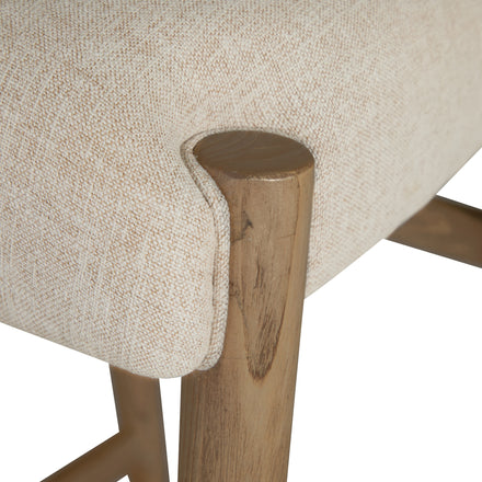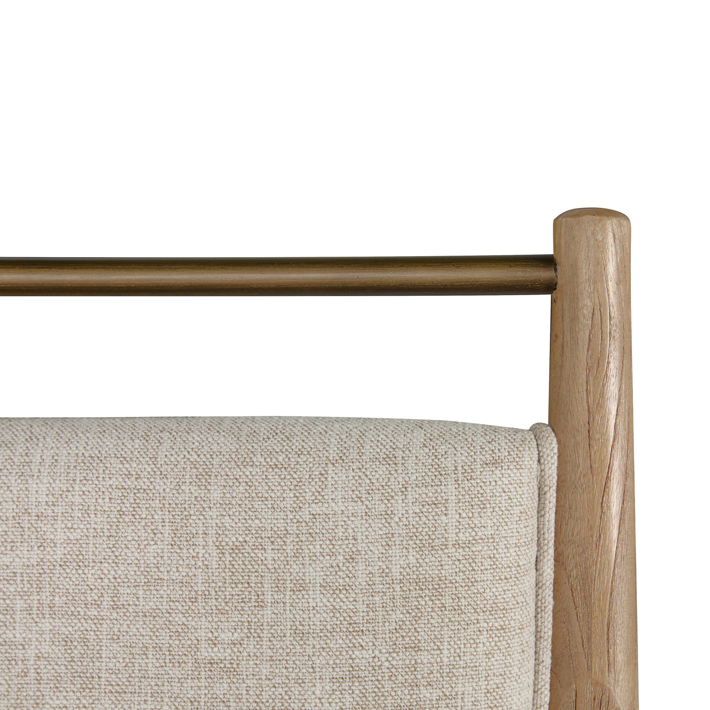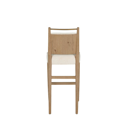 The Highland Bar Stool in Dawn captures a perfect blend of light, modern design and timeless craftsmanship. Crafted from oak in a warm Dawn finish, the frame showcases natural wood grain that pairs beautifully with the soft Slipaway Sand performance fabric. The cushioned seat and upholstered back ensure lasting comfort, while the subtle brass-toned accent bar across the top adds both a refined detail and a convenient handhold for easy movement. With its clean lines, balanced proportions, and durable materials, this stool brings effortless sophistication to casual dining spaces, kitchen islands, or home bars.