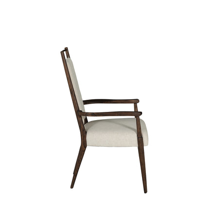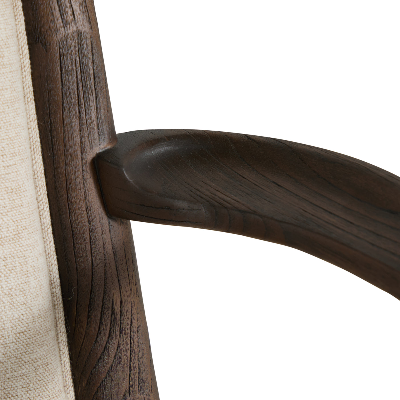 The Highland Dining Arm Chair in Dusk pairs refined design with rich character. Constructed from oak in a deep Dusk finish, it exudes warmth and dimension, perfectly offset by the light Slipaway Sand performance upholstery. The chair’s sculpted arms, supportive back, and brass-toned accent bar create a harmonious balance between comfort and style. Ideal for dining rooms that blend modern and traditional sensibilities, this arm chair embodies effortless sophistication.