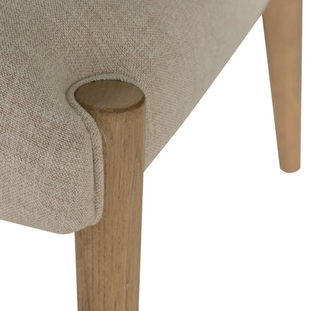 The Highland Dining Side Chair in Dawn offers a minimalist profile that radiates timeless charm. Crafted from oak in a soft Dawn finish, the frame’s tapered legs and slim silhouette highlight meticulous craftsmanship. The Slipaway Sand performance fabric complements the natural wood tones, while the cushioned seat and high back ensure lasting comfort. A brass-toned accent bar adds a touch of refinement, making this chair an elegant addition to any dining setting.
