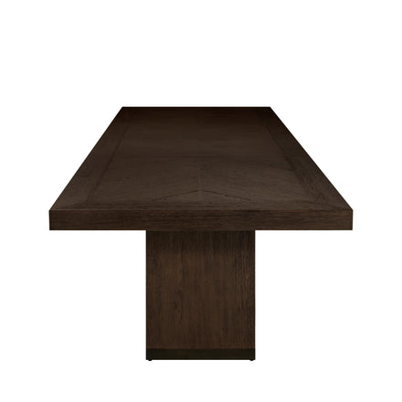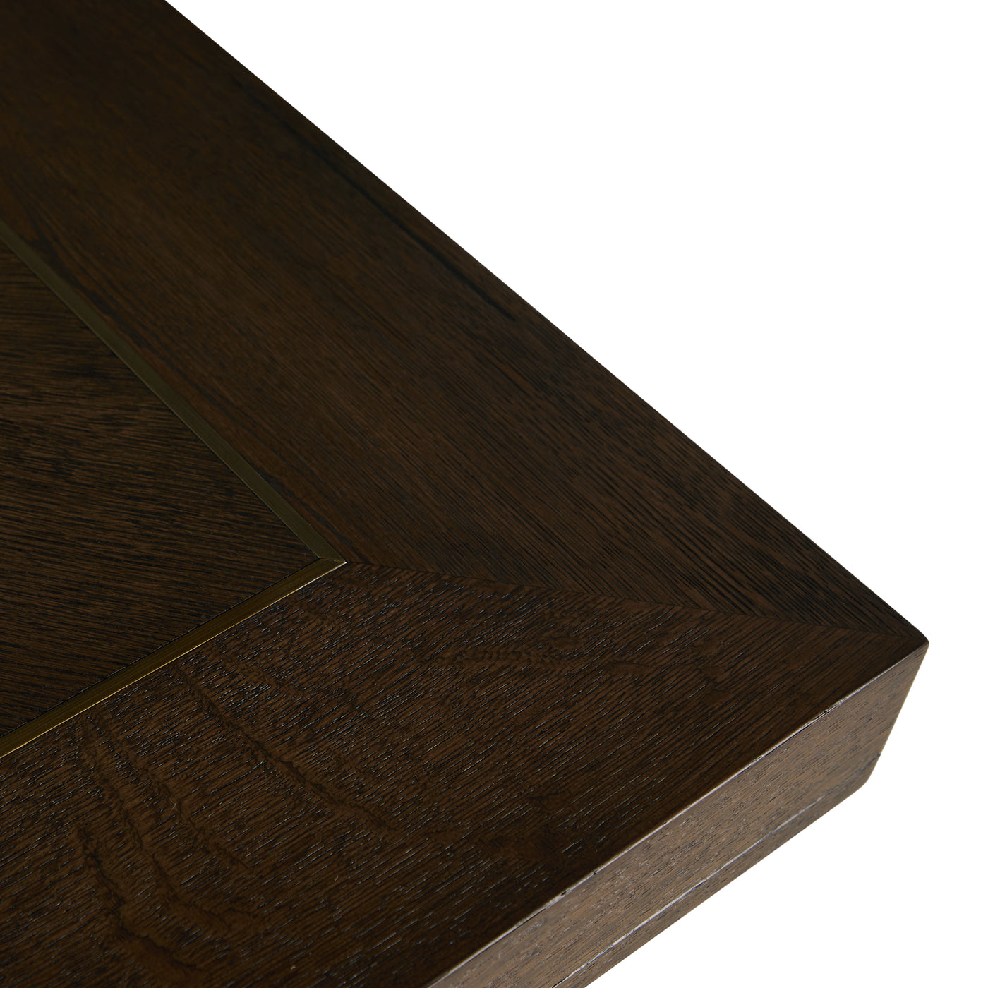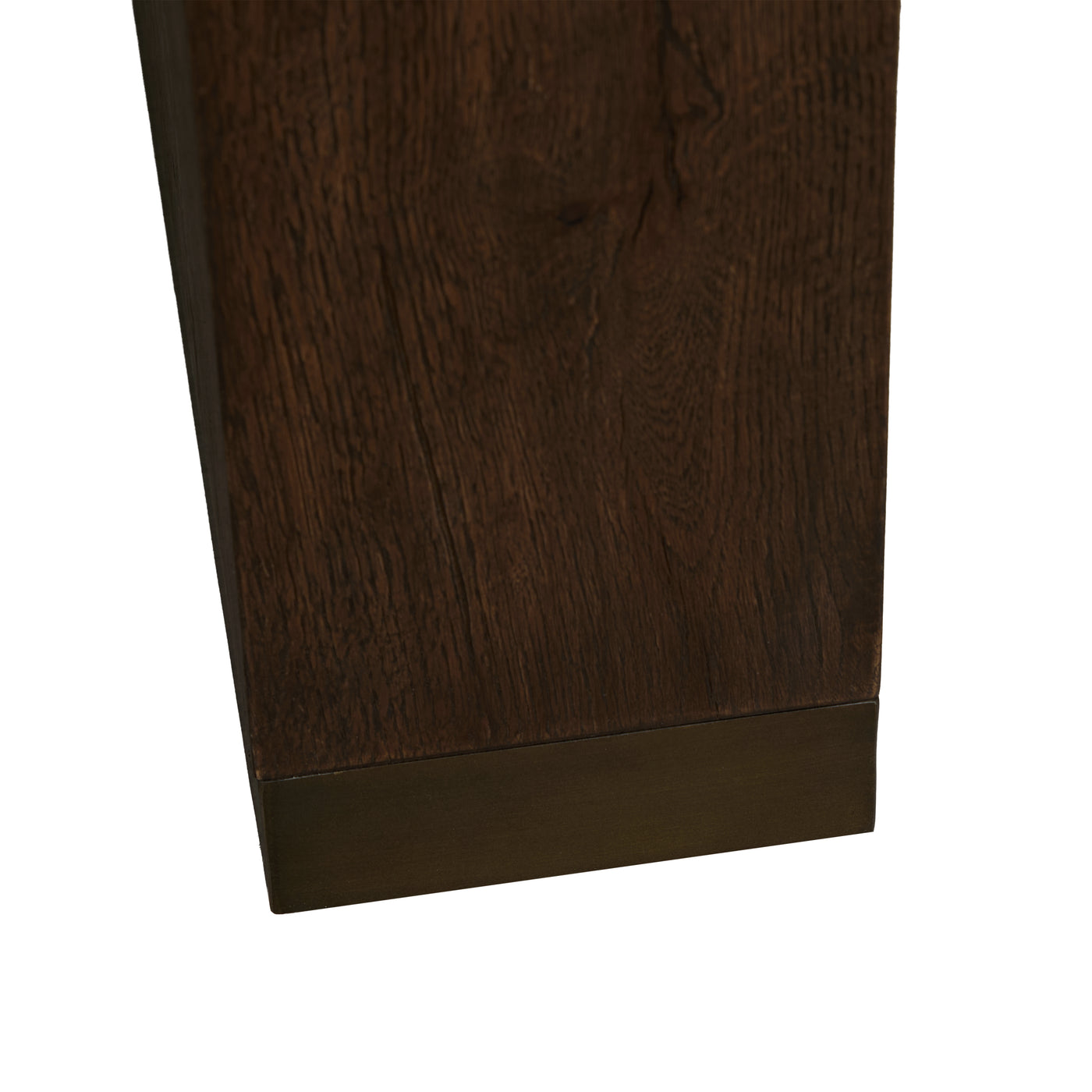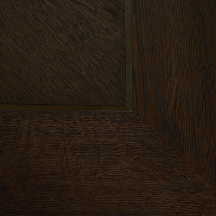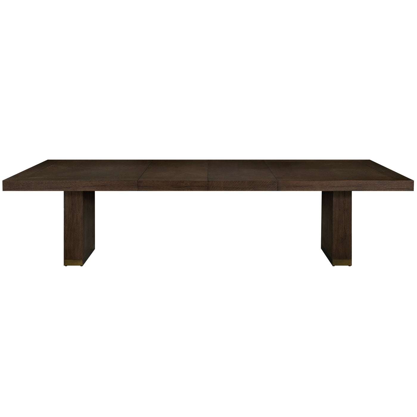 The Highland Extension Dining Table in Dusk blends modern minimalism with rustic character for a look that feels grounded and refined. Built from oak in a rich Dusk finish, the table showcases a striking chevron-like inlaid pattern across its top that adds depth and visual intrigue. Brushed bronze metal accents around the tabletop and at the base complement the deep tone of the wood, enhancing its modern-rustic appeal. Designed with versatility in mind, the table extends from 78 inches to an impressive 118 inches with two 20-inch leaves, providing seating for up to twelve. The result is a statement piece that balances clean geometry with the warmth of natural materials—perfect for gathering and entertaining in style.