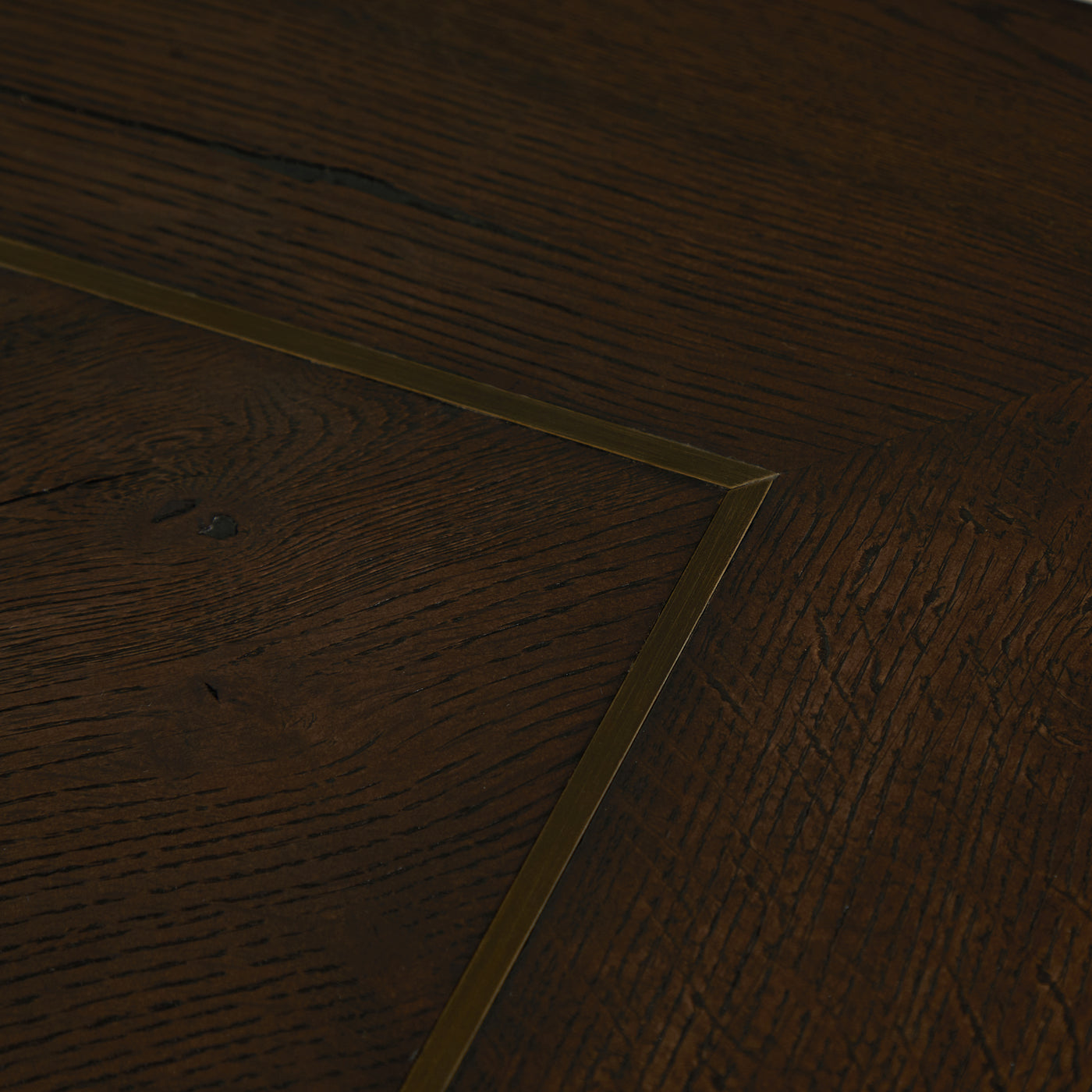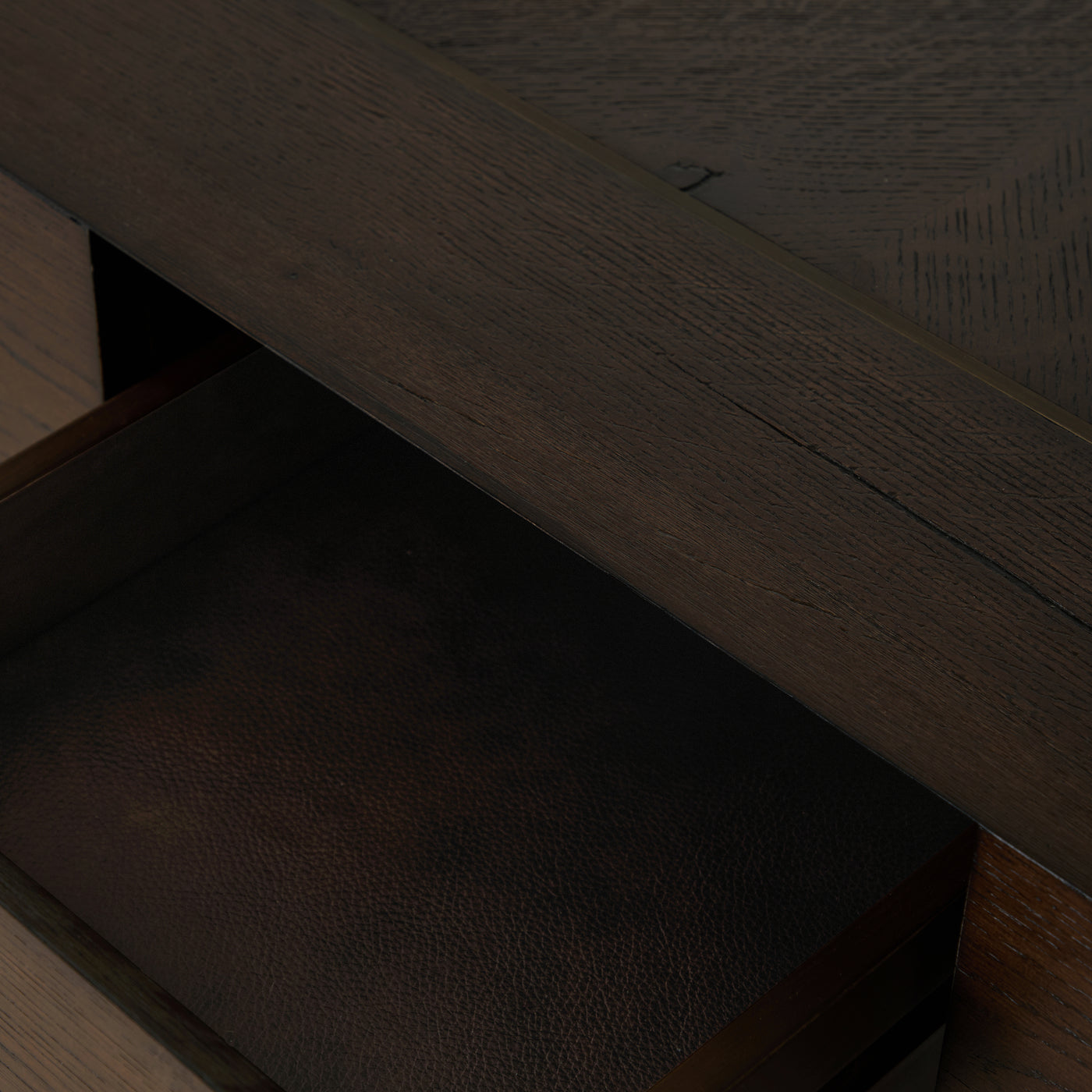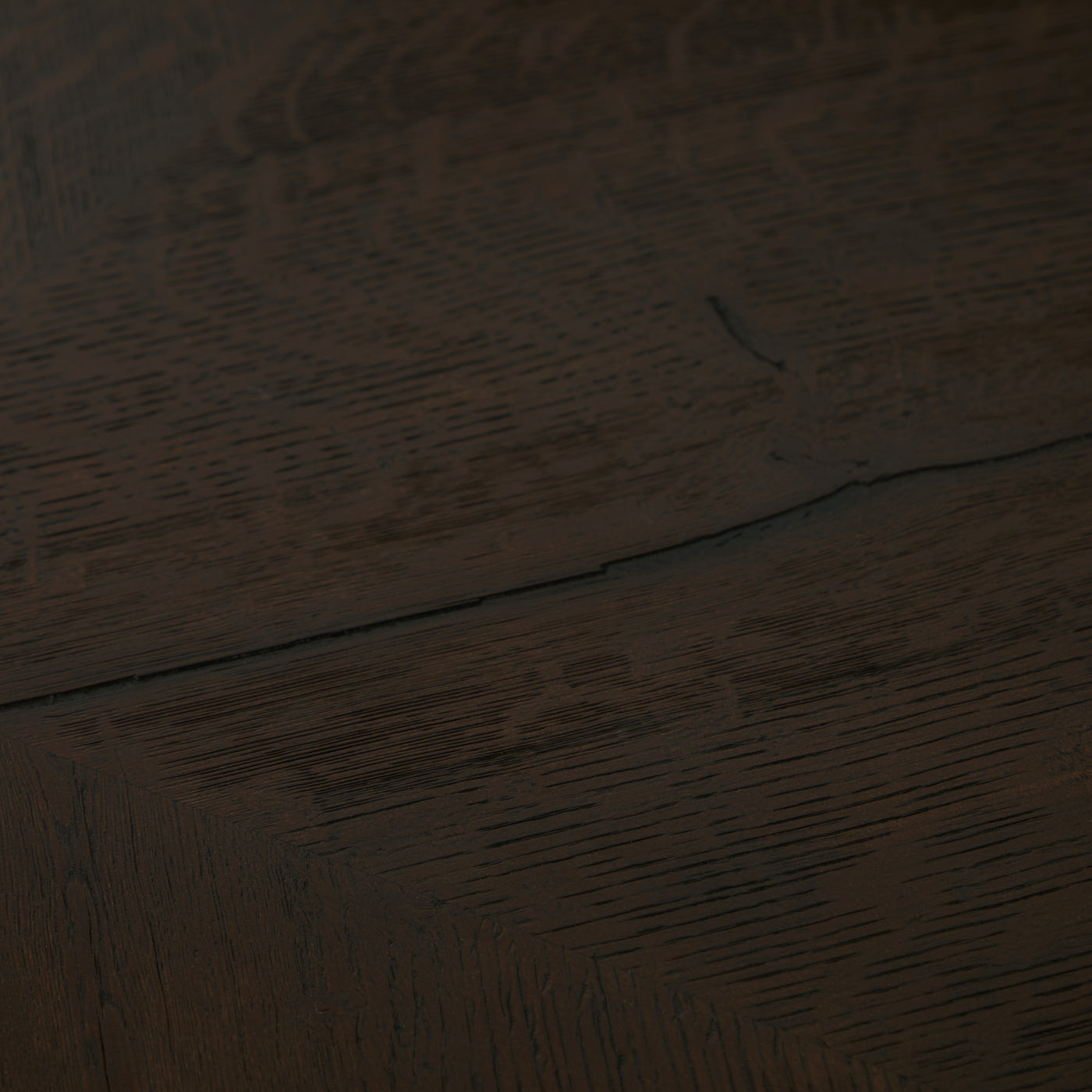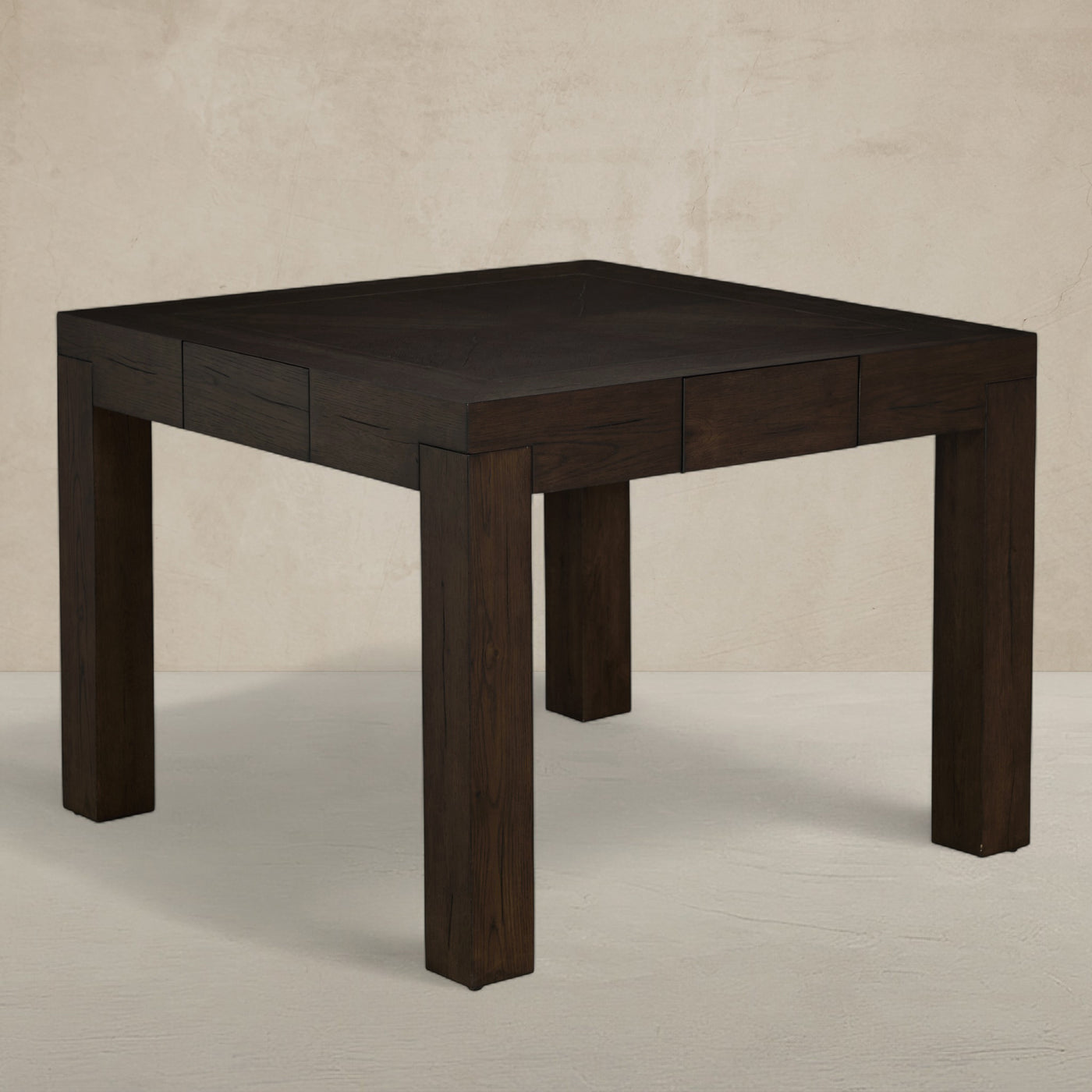 The Highland Square Dining Table in Dusk combines modern design with timeless materiality for a look that feels grounded and elegant. Made from rustic oak in a deep Dusk finish, the table showcases clean, architectural lines accented by brushed bronze metal for a hint of contrast. The top features a distinctive inlaid wood pattern, celebrating the natural character of the oak. Each of the four drawers, discreetly integrated into the apron and lined in dark brown top-grain leather, enhances both form and function—ideal for storing dining accessories or playing cards when used as a game table. With its rich tone and refined details, the Highland Square Table in Dusk anchors any space with warmth and sophistication.