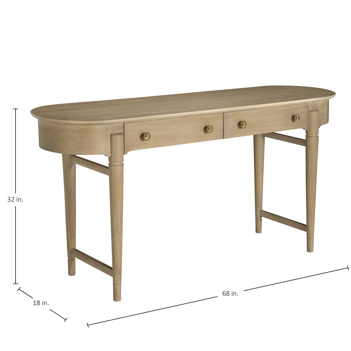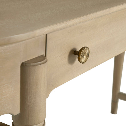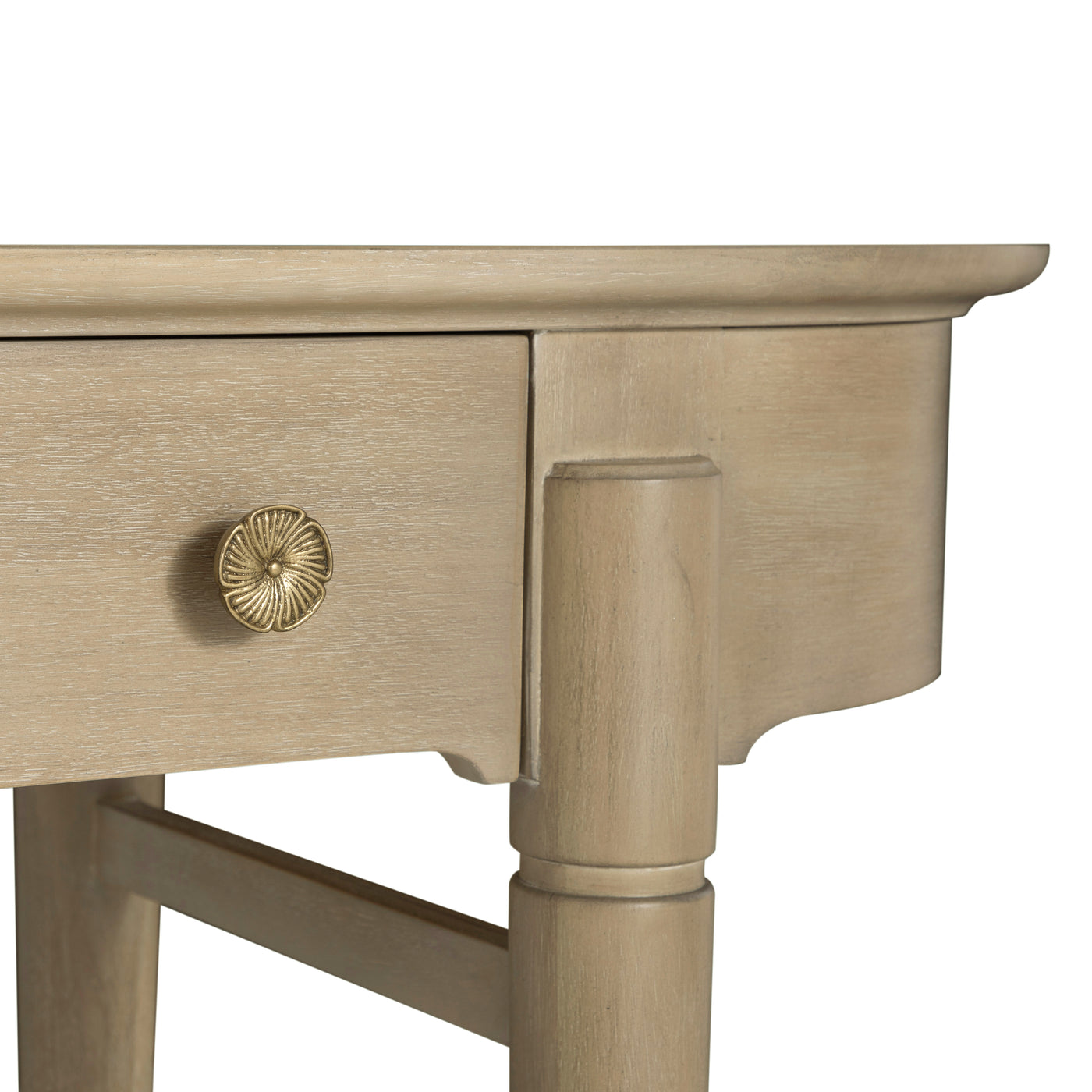 The Rosebank Console blends timeless elegance with refined craftsmanship. Made from mahogany in the Drift finish, it features a graceful silhouette with rounded corners and finely tapered legs that bring a touch of softness and sophistication. The console’s two soft-close drawers are adorned with satin brass pulls, each engraved with a delicate rose motif that lends an elevated, decorative detail. The tabletop’s ribbon-cut veneer creates a subtle radiating pattern, adding texture and visual warmth. Versatile and refined, the Rosebank Console works beautifully in an entryway, behind a sofa, or as a refined accent in a dining or bedroom setting.