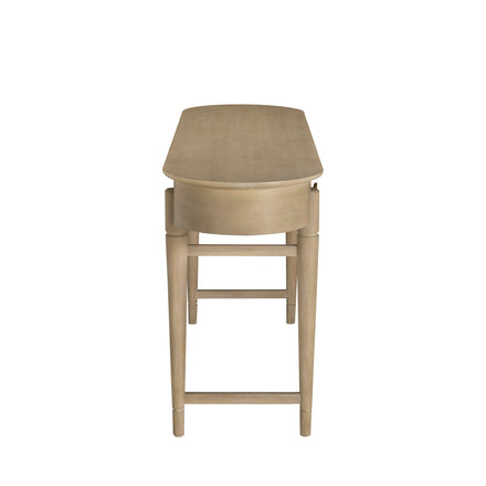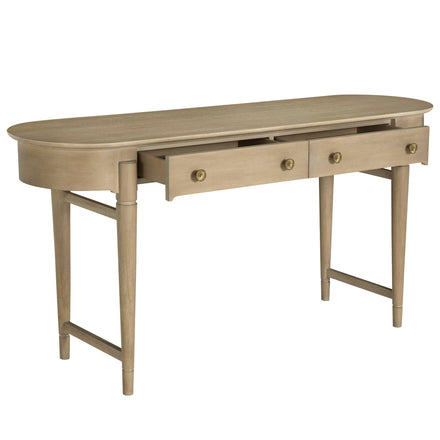 - Rounded corners and tapered legs enhance the console's graceful form.