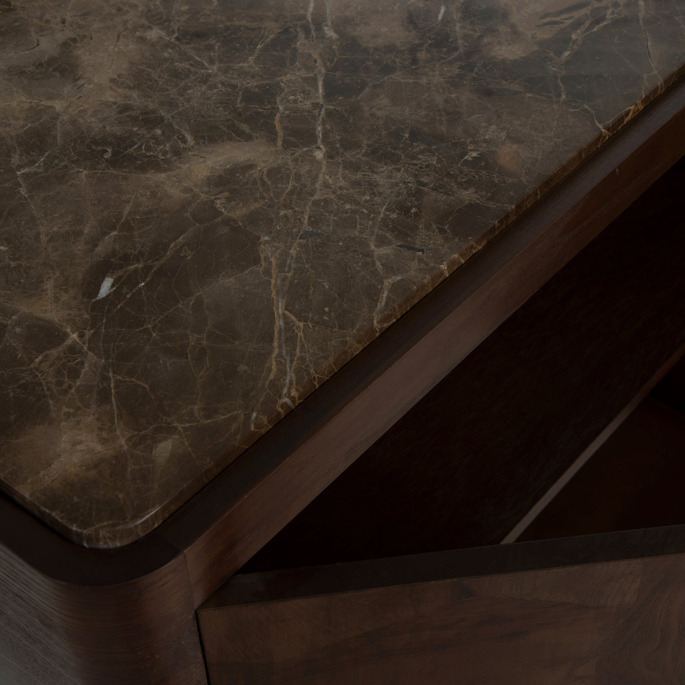 - Dark Emperador marble top with natural veining.