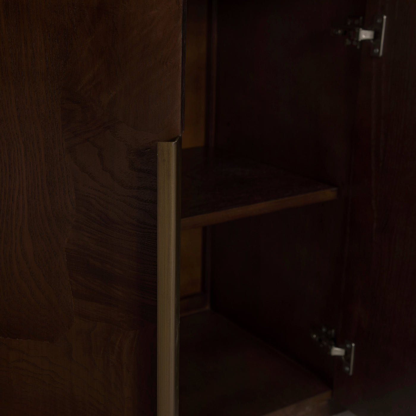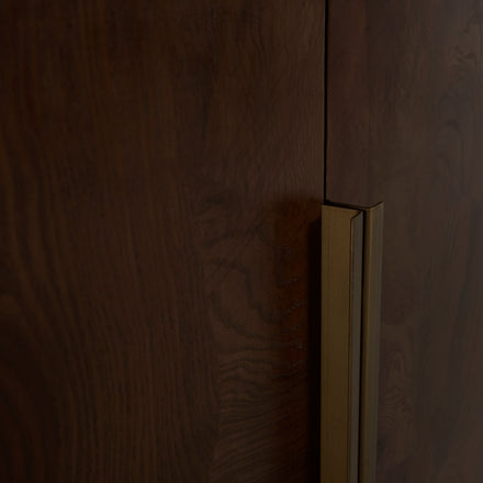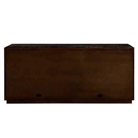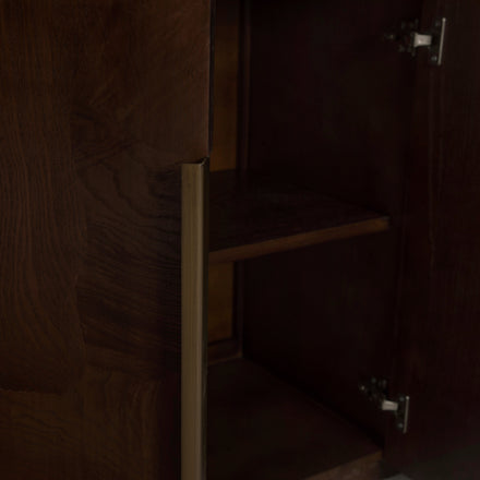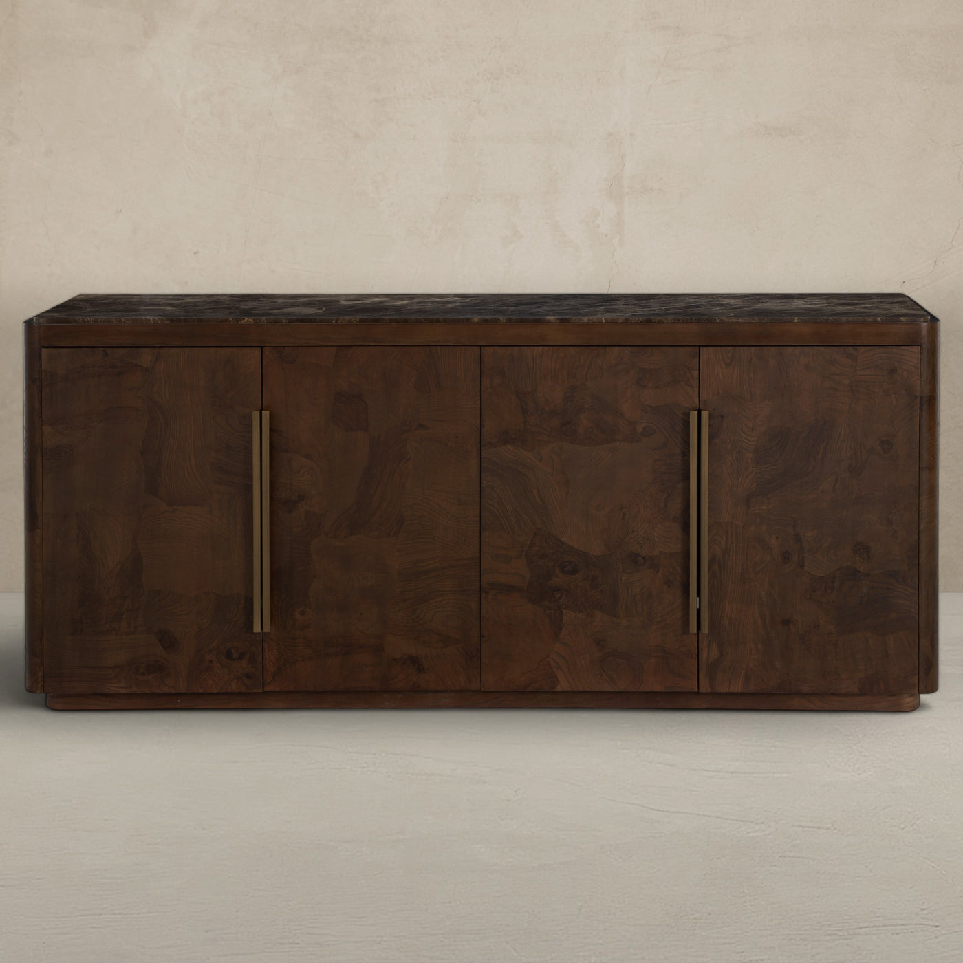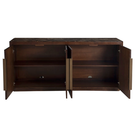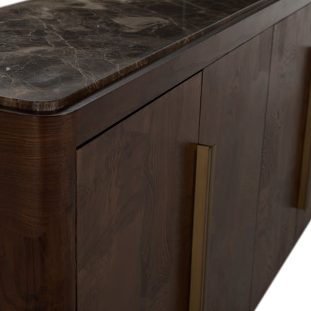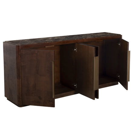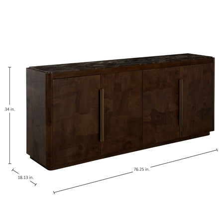 The Summit Sideboard is a masterful blend of natural materials and refined design, offering both beauty and functionality. Crafted from Olive Ash Burl, the case showcases mesmerizing grain patterns that make each piece entirely unique, with rich tonal depth and a luminous finish that highlights the natural artistry of the wood. The top is made from Dark Emperador marble, a prized stone known for its deep, earthy brown tones veined with lighter streaks, adding a layer of sophistication and timeless appeal. Sleek brushed brass hardware complements the warm palette, providing a subtle metallic contrast that enhances the overall elegance. Behind its four doors, two spacious shelves provide ample storage for serveware, linens, or dining essentials. The Summit Sideboard stands as a statement of craftsmanship and taste—perfect for anchoring a dining room or entryway with elevated, enduring style.