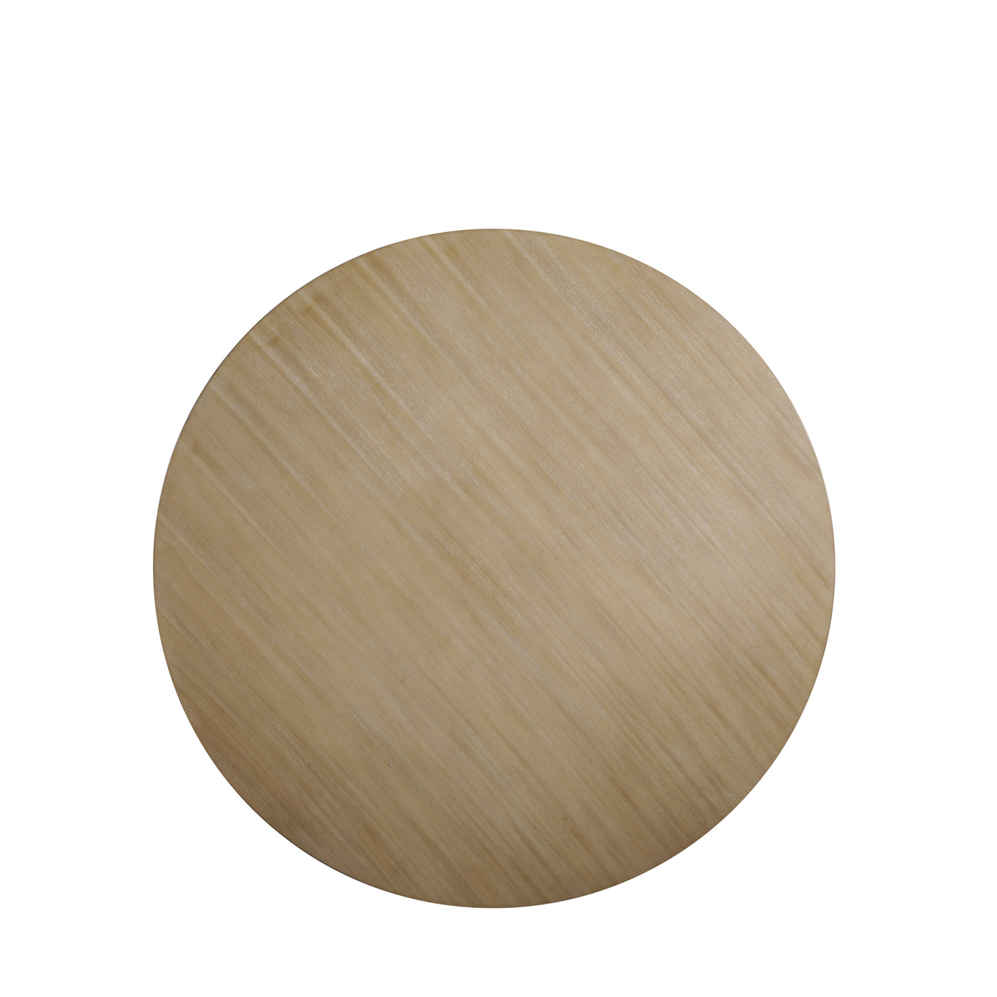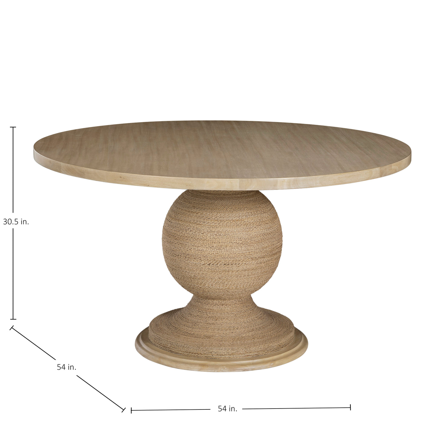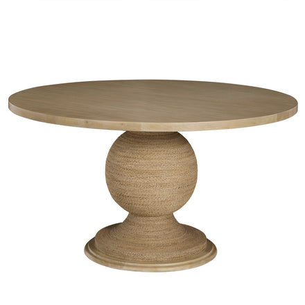 The Triton Dining Table brings natural beauty and craftsmanship together in a striking, sculptural form. Made from mahogany in the Drift finish, its 54-inch round top features a ribbon-cut veneer design that accentuates the organic movement of the wood grain. The bold pedestal base, meticulously wrapped in handwoven banana leaf rope, adds tactile warmth and visual depth while highlighting the use of sustainable, renewable materials. Its round shape encourages easy conversation and connection, comfortably seating up to six people for dining. Whether placed in a dining room for intimate gatherings or styled in a foyer as an elegant statement piece, the Triton captures the perfect balance between artistry, sustainability, and timeless design.
