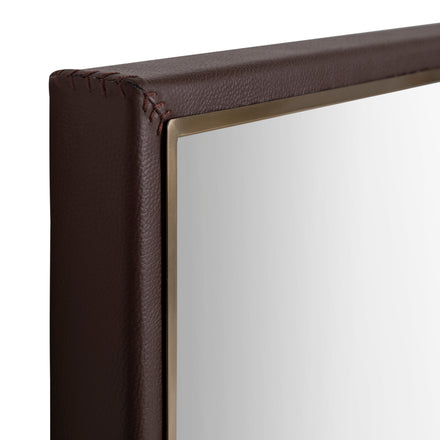 The Torbin Mirror combines refined craftsmanship with a sleek, contemporary sensibility. Its rectangular silhouette features clean, straight edges framed by a thin border of metal in an Antique Mountain Brass finish, complemented by a rich dark brown top-grain leather surround. Hand-stitched corner detailing adds an artisanal touch, highlighting the material’s natural texture and quality. With its slender profile, the Torbin Mirror introduces light and balance to darker, moodier interiors, offering a subtle interplay of metal, leather, and reflection. Timeless and versatile, it’s a sophisticated accent for modern living spaces, bedrooms, or entryways.