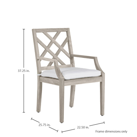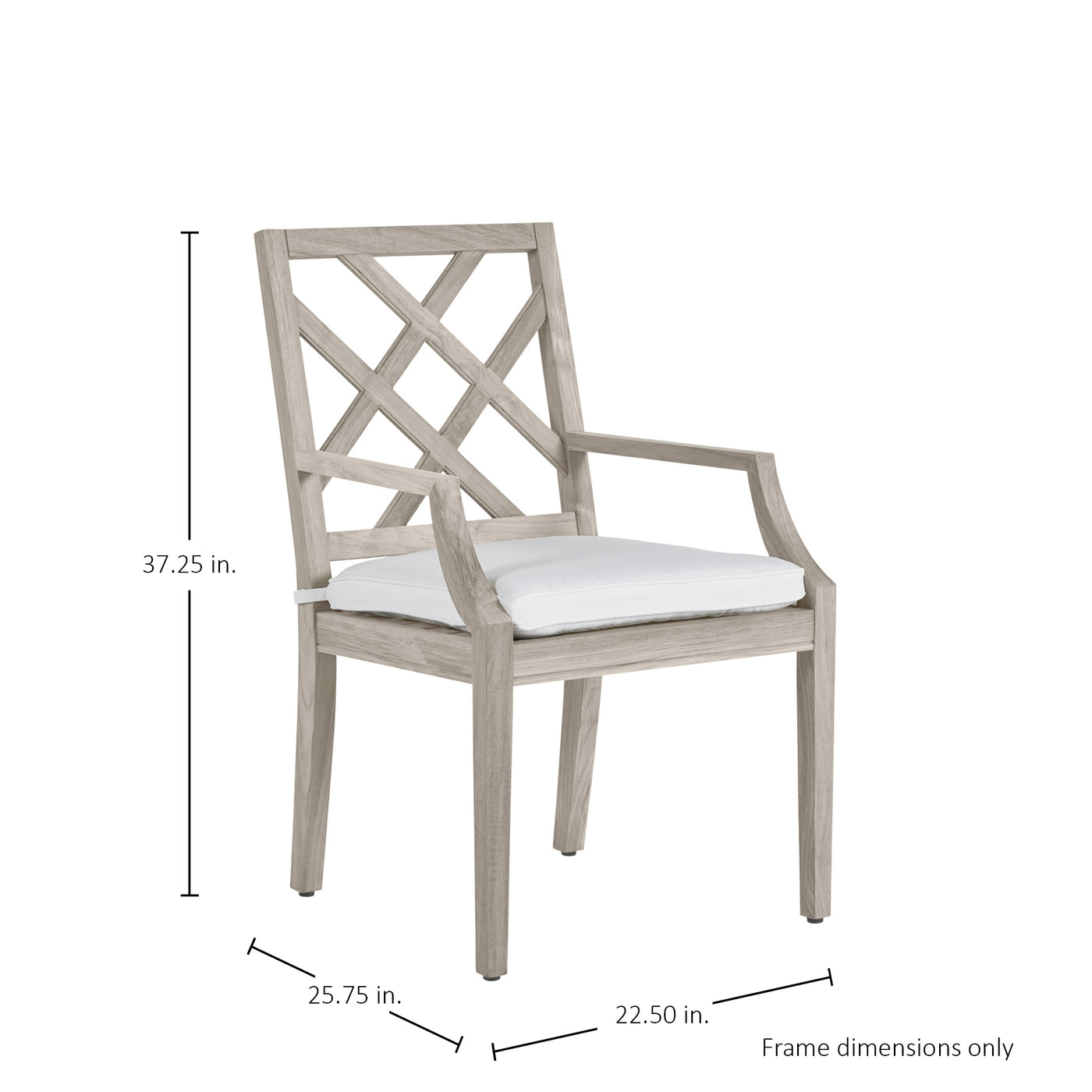 The Haley Teak Arm Chair is a classic. Made of durable, Indonesian teak, it features a traditional latticework back and finely detailed armrests. The simple elegance of the Haley Arm Chair makes it a perfect choice for any outdoor dining room. Embrace the lasting luxury of this Indonesian teak furniture, knowing that it hails from FSC-certified sources committed to ecological stewardship. This item is designed to be enjoyed either with or without a cushion. Please designate your choice in the below "Select a Cushion" dropdown.