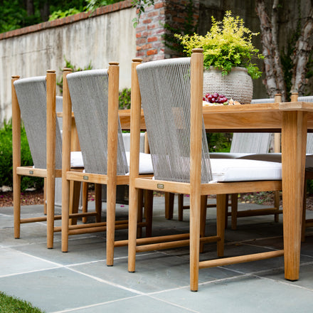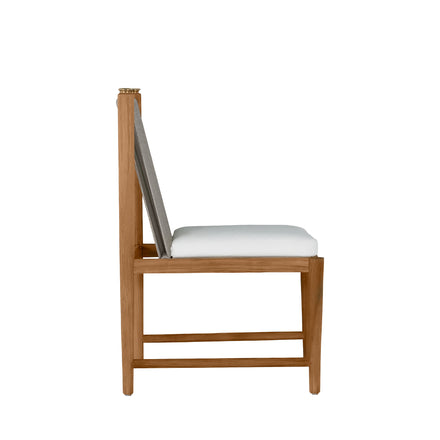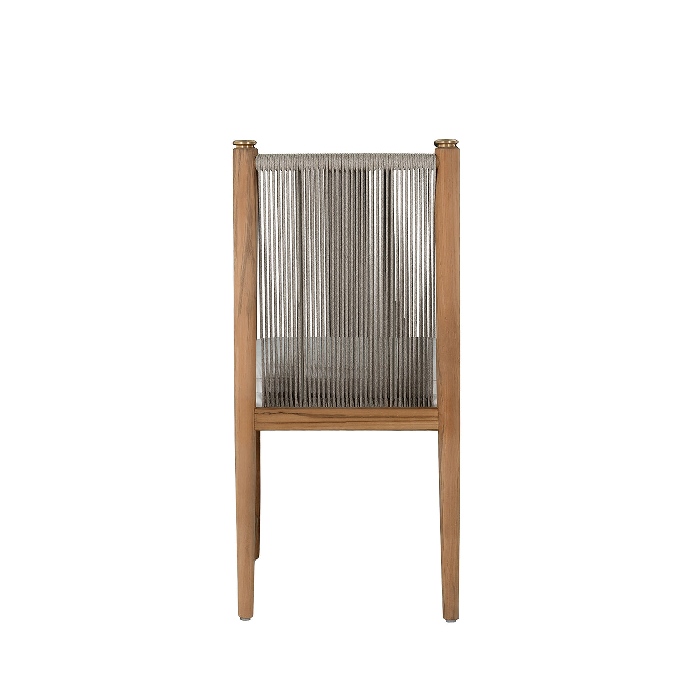 Discover the Pacifica Dining Side Chair, a perfect union of nautical flair and modern style. Crafted from Indonesian teak with vertical olefin rope and elegant brass toppers, it's designed for stylish durability. Comfort meets luxury with a seat cushion and a distinctive rope back, promising longevity and effortless upkeep. This chair ensures an outdoor dining experience that's as serene as it is sophisticated, aging gracefully without the need for extra care.