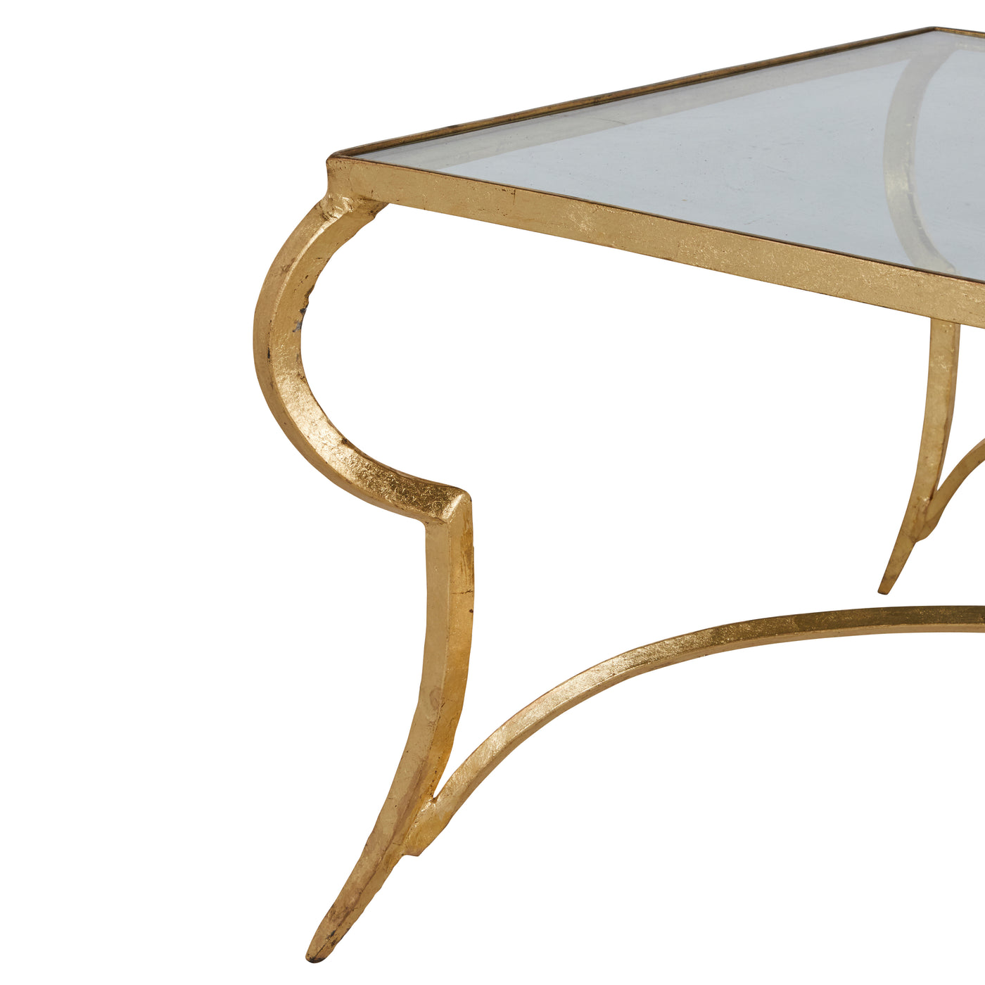 The Evelina Coffee Table features a gracefully curved iron base that offers a simple yet sculptural design, beautifully revealed through the tempered glass tabletop. Embellished with a luxurious gold leaf finish, the table legs elegantly stretch across the length and width of the coffee table. The combination of iron and tempered glass creates a striking balance between strength and elegance, making the Evelina Coffee Table a perfect centerpiece for any living space.