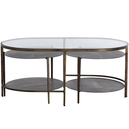 A true shape shifter, the Northampton Coffee Table offers the option of expanding its reach whenever the need arises. Its oval, tempered glass-top mainframe houses a pair of tiered tables that swing out for convenient access, perfect for accommodating more snacks on game days or wine bottles at book club gatherings. The silver acid-etched finish on the smaller nesting table tops contrasts beautifully with its champagne-finished iron frame, creating a striking balance of elegance and functionality. This versatile design seamlessly blends with a variety of decor styles, making it a sophisticated and practical addition to any living space.