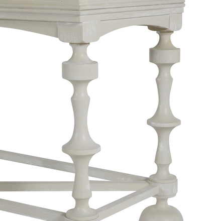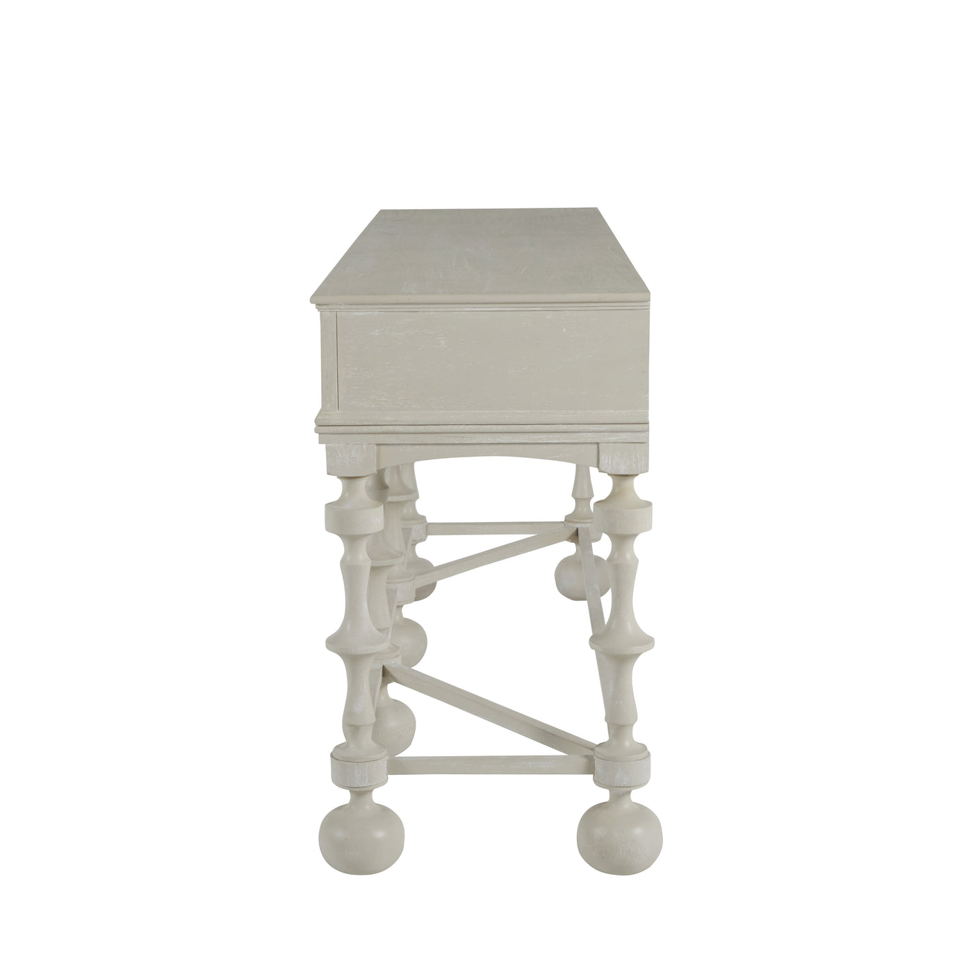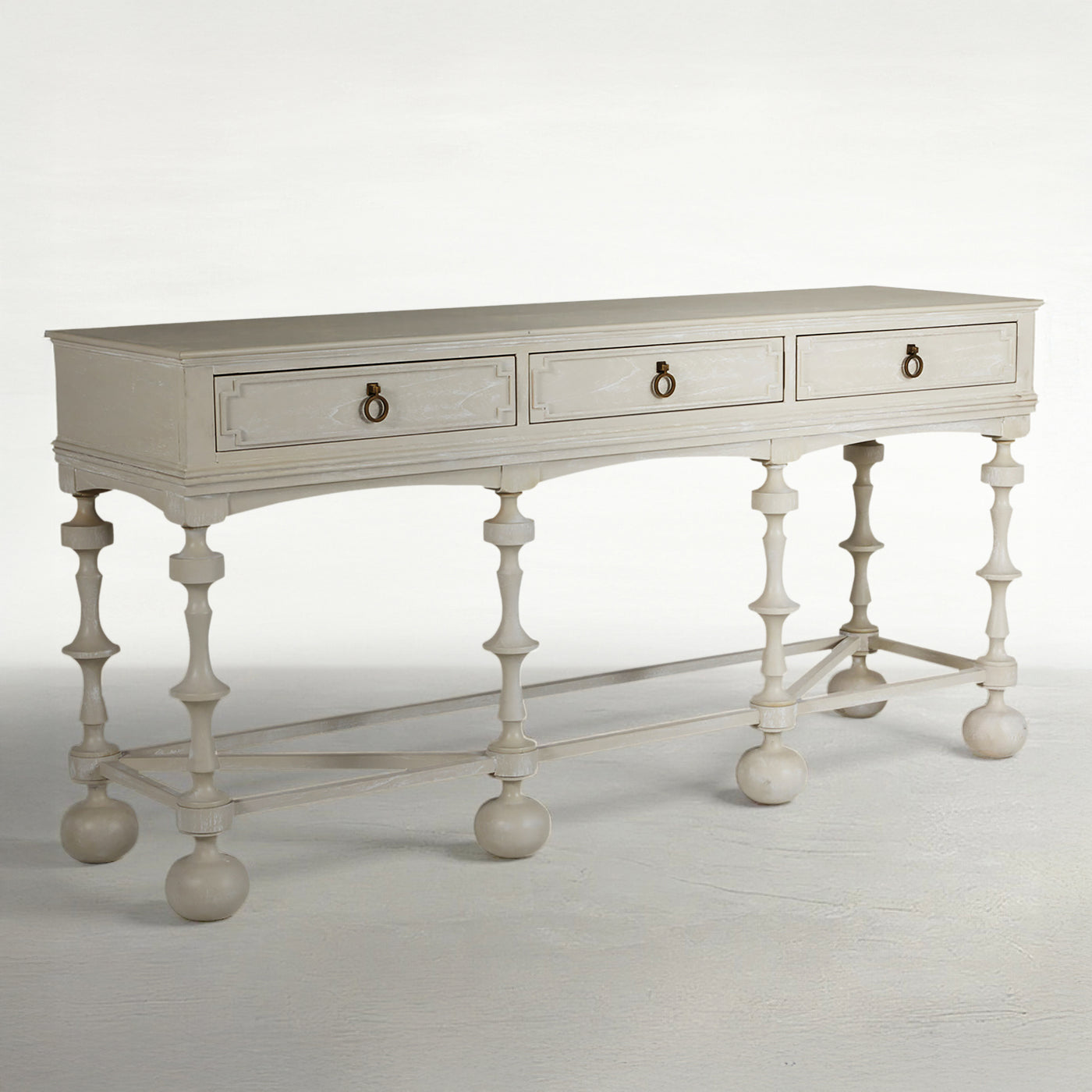 The Arrington Console Table brings a refined elegance and a bold artistic style to any entryway or living space. Crafted with meticulous attention to detail, this table features tall distinctively turned legs that are a contemporary twist to a vintage and classic style. Crafted from mindi and rubber wood, this sophisticated design is finished in a cerused white with three spacious drawers adorned with antique brass ring pulls. Its versatile finish complements a variety of decor styles, making it a timeless piece for your home. Also aviable in a dramatic cerused ash finish.