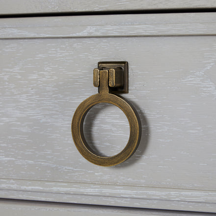 - Includes three spacious drawers with antique brass ring pulls, combining elegance with practical storage