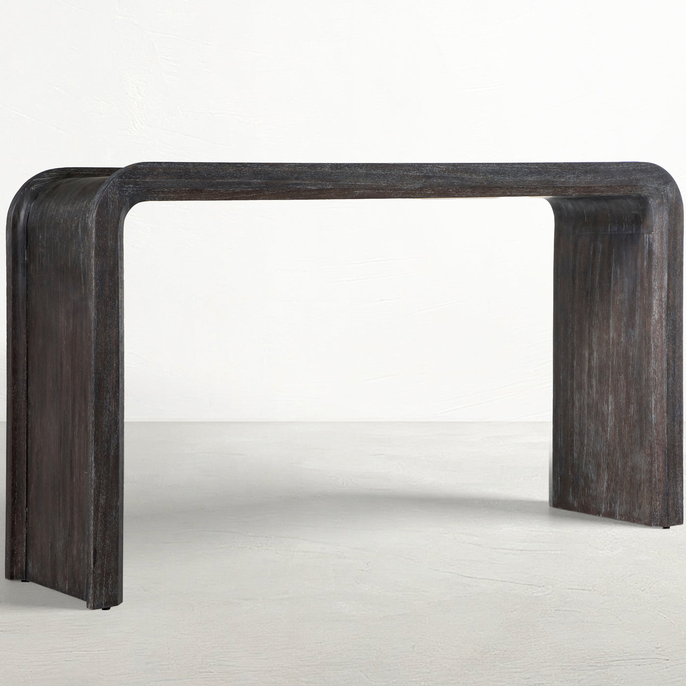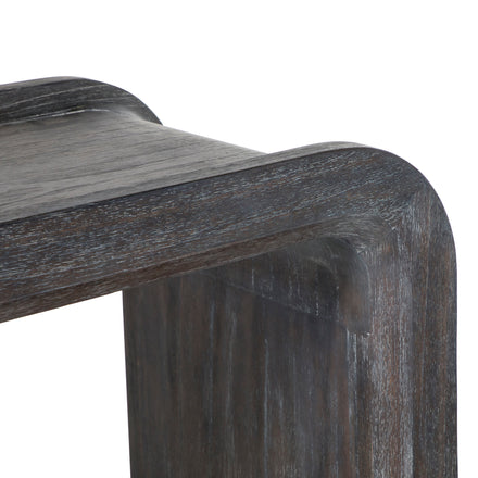 The Norman Console has a streamlined profile crafted from mindi wood with a cerused ash finish. This table seamlessly flows from one end to the other, offering a lovely and simple design. Perfect for entryways, living rooms, or hallways, the Norman Console adds a warm and elegant touch to various interior settings, providing both functionality and aesthetic appeal. Enhance your space with this beautifully crafted console table that combines simplicity with sophistication.