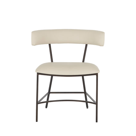 The Matlock Dining Chair exudes a blend of modern sophistication and classic elegance, making it a standout addition to any dining area. Crafted with a sleek metal frame finished in a dark bronze, this chair offers a sturdy yet stylish foundation. The seat and backrest are upholstered in white faux leather, providing both comfort and a touch of luxury. The unique design features clean lines and a contemporary silhouette, ensuring it complements a variety of interior styles. Ideal for both formal dinners and casual gatherings, the Matlock Dining Chair promises to elevate your dining experience with its refined aesthetic and exceptional comfort. Also available in a white faux leather with a brass finish.