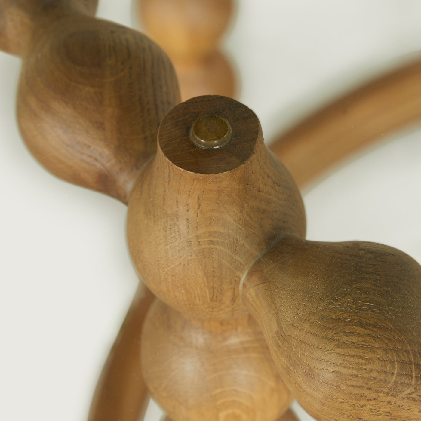 The Gwen Dining Table pairs a whimsical bobbin-turned oak base with a sleek tempered glass top. Its satin-finished wood provides a soft, natural warmth, while the airy transparency of the round glass surface allows the intricately shaped legs to take center stage. Perfect for transitional, coastal, or modern interiors, Gwen blends classic craftsmanship with playful elegance in a form that feels both grounded and graceful.