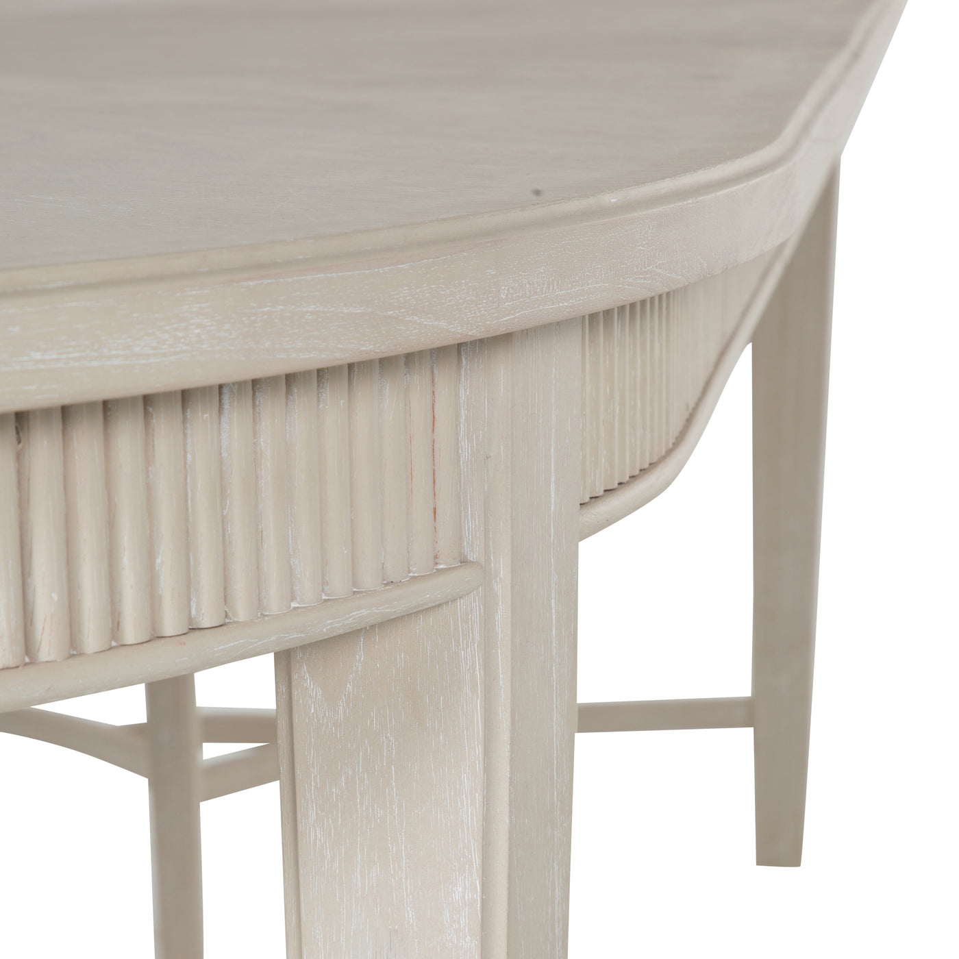 The Whitlock Dining Table exudes timeless elegance with its cerused white finish and classic design. This Table features an oval shape and includes a 20-inch leaf that extends to accommodate additional guests. Crafted from durable mindy wood, this dining table features a refined oval shape and intricately detailed edges, adding a touch of sophistication to any dining space. The sturdy construction ensures lasting quality, making it an ideal centerpiece for family gatherings and entertaining guests. The Whitlock Dining Table seamlessly blends traditional charm with contemporary style, creating a versatile piece that enhances any decor. This design also comes in a dark and natural cerused finish. This product uses natural or handmade materials, so variations in color and pattern are to be expected and celebrated.